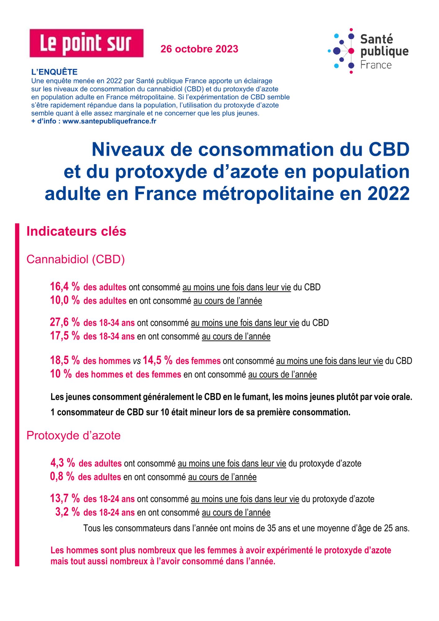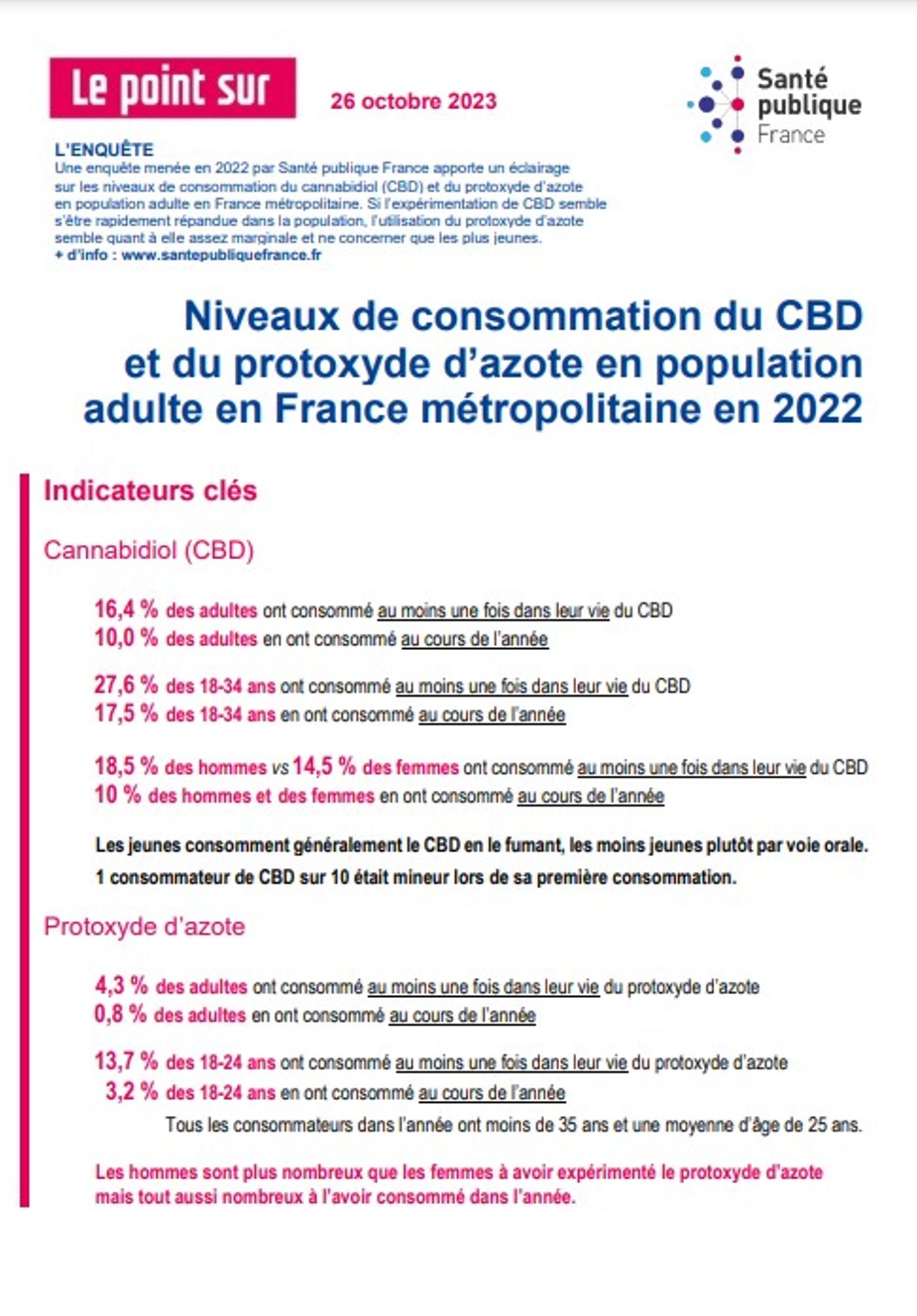 - 4,3 % des adultes ont consommé au moins une fois dans leur vie du protoxyde d’azote