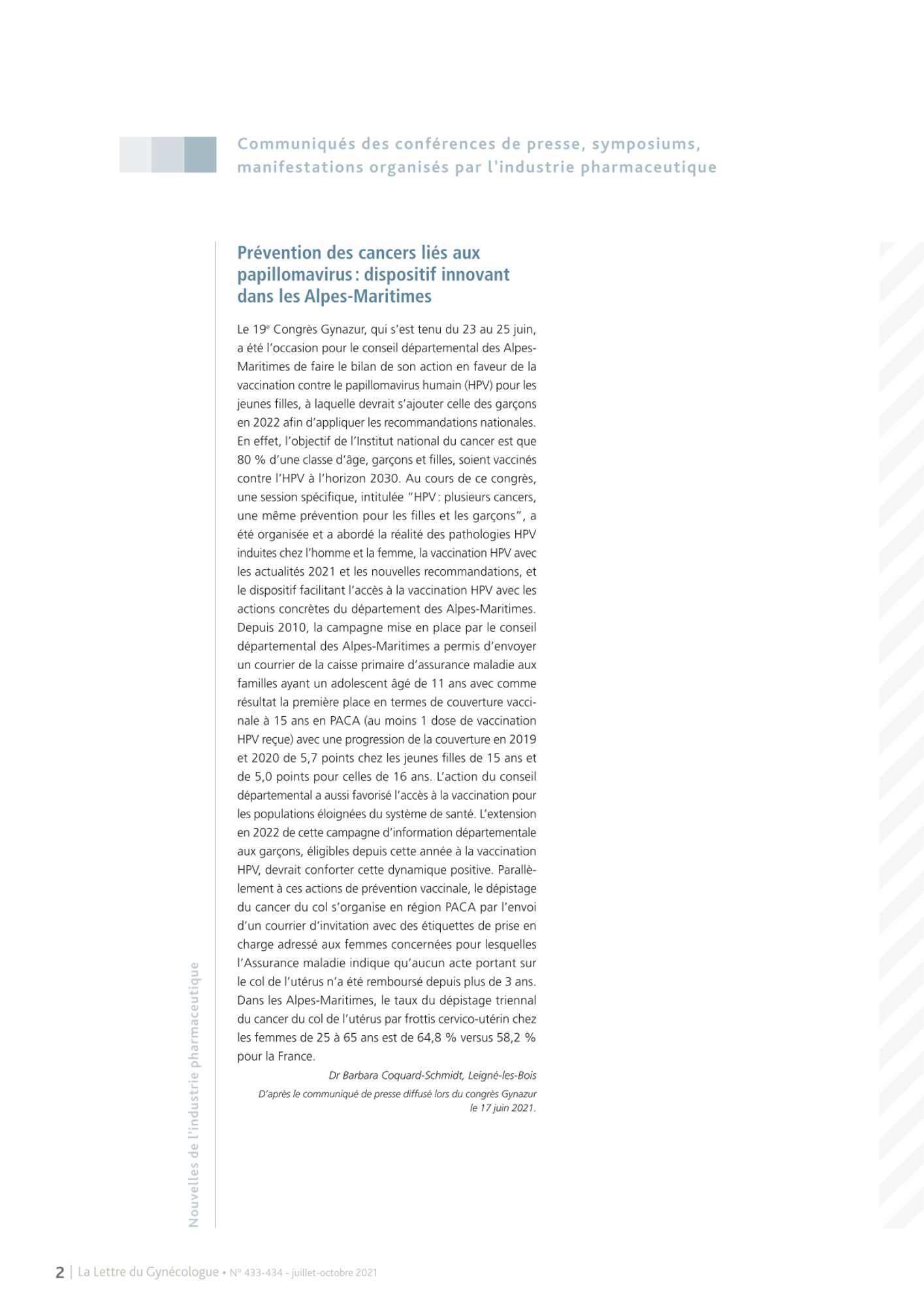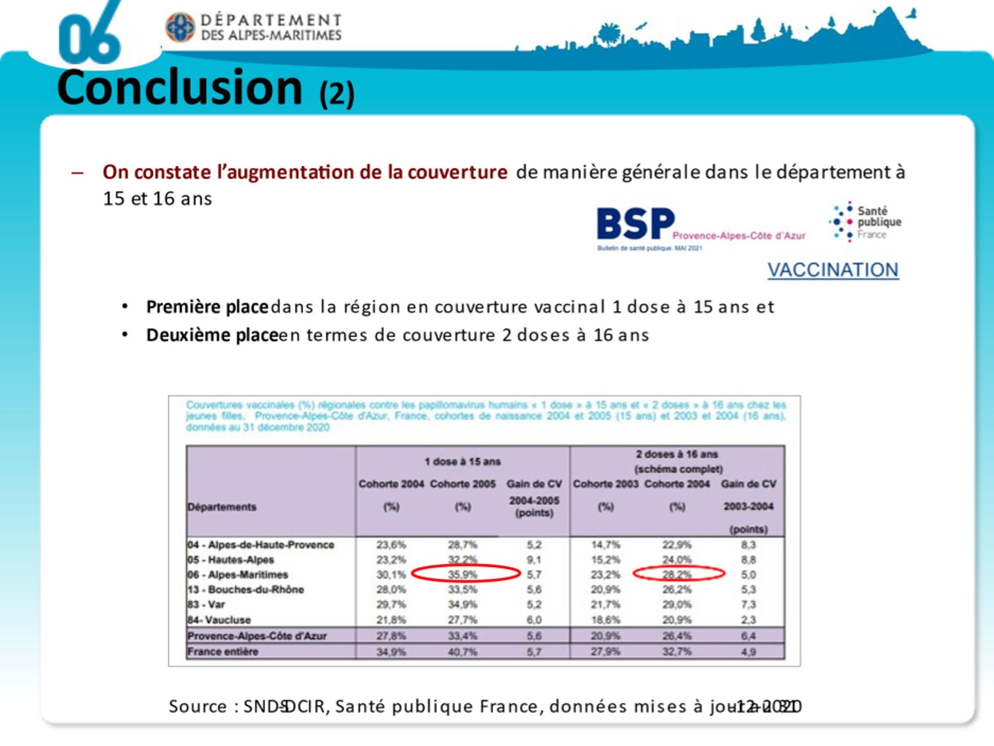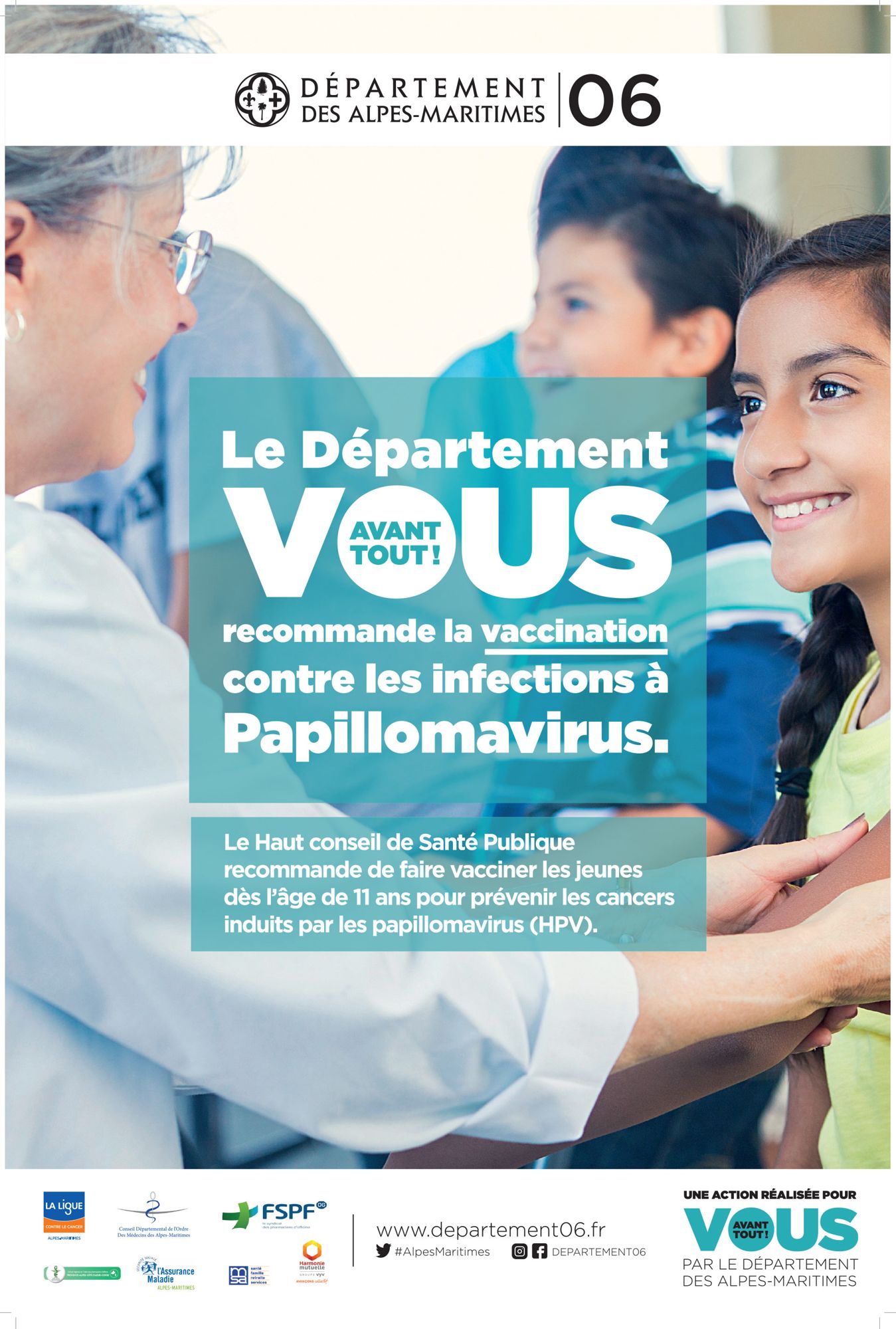 Par ailleurs, depuis 2010, le service de PMI du Conseil départemental gère la campagne de vaccination contre les infections à HPV avec les 7 partenaires conventionnés (conseil départemental de l’ordre des médecins, conseil régional de l’ordre des pharmaciens, chambre syndicale des pharmaciens des Alpes-Maritimes, caisse primaire d’assurance maladie, MSA, Ligue contre le cancer et Harmonie Mutuelle). Ce dispositif a pour but d’une part d’informer largement les familles des jeunes filles âgés de 11ans sur cette vaccination, et d’autre part de prendre en charge la partie du ticket modérateur des vaccins en faveur des familles de ces jeunes ne disposant pas de complémentaire santé. Suite à l’élargissement en 2019 pour les garçons par la haute autorité de santé, le dispositif est étendu actuellement aux garçons de 11 ans.