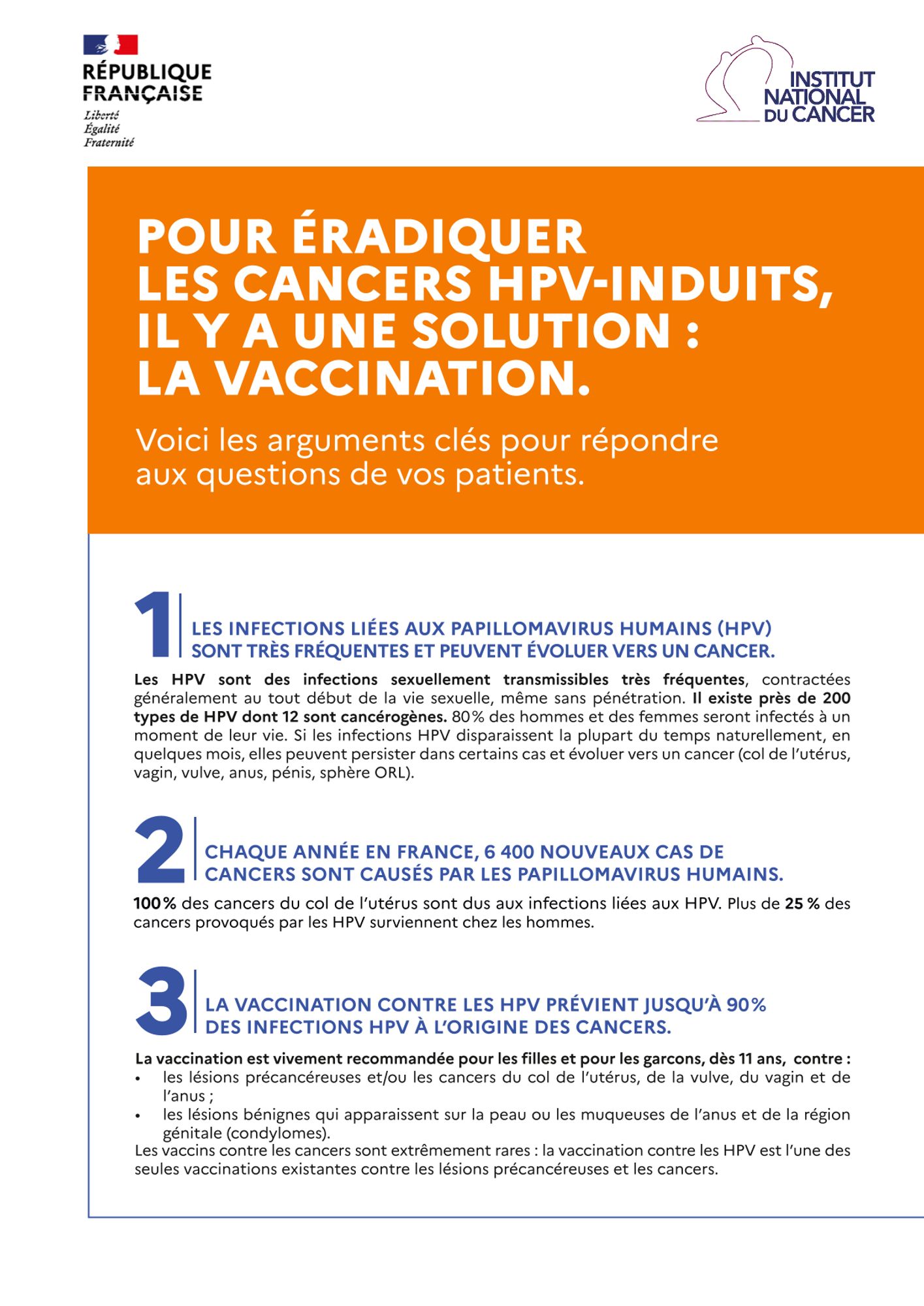 Pour éradiquer les cancers HPV-induits, il y a une solution : La Vaccination INCA - 2023 Voici les arguments clés pour répondre aux questions de vos patients. Consultez le document (78.3 Ko) Téléchargez le document