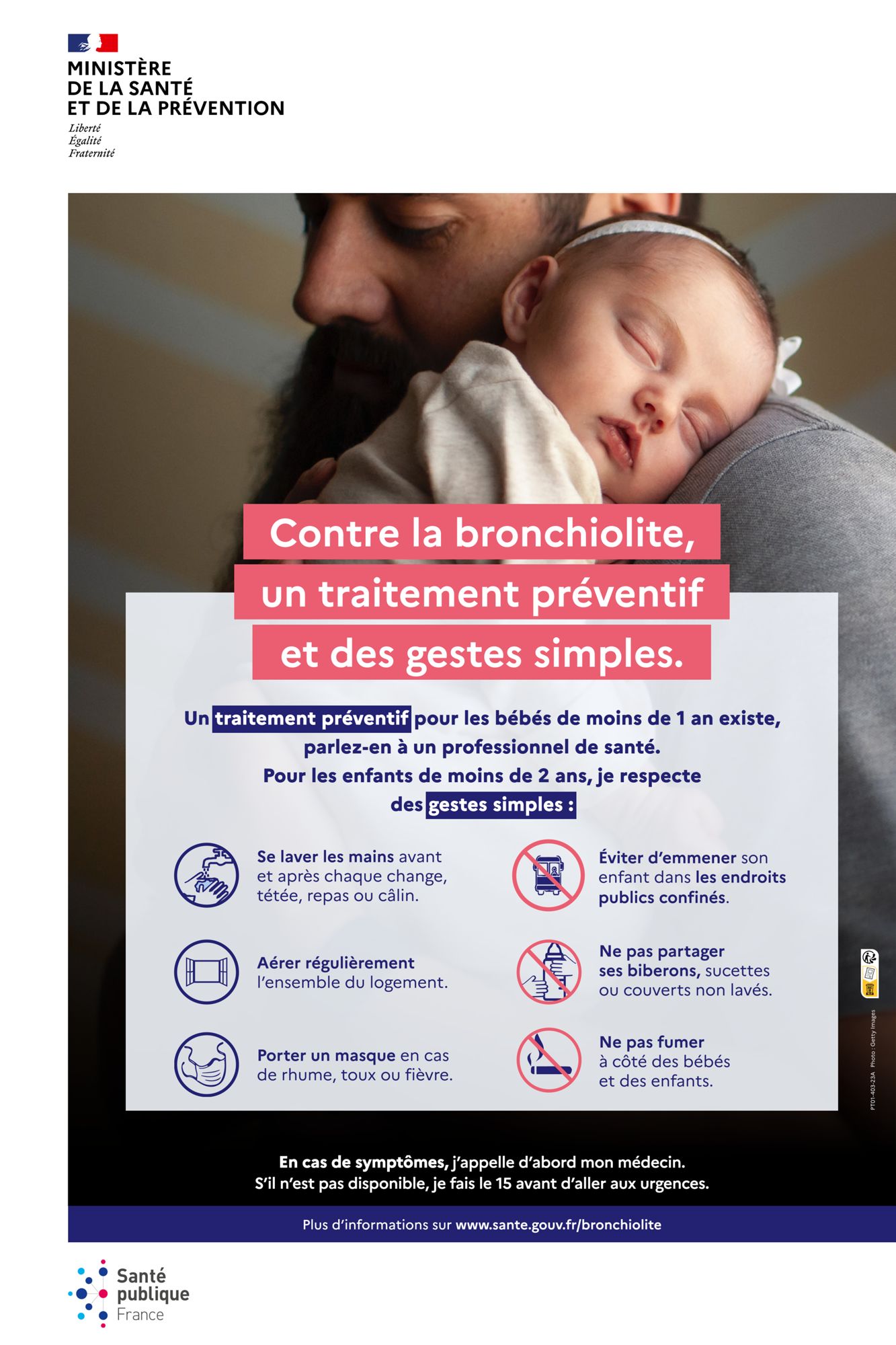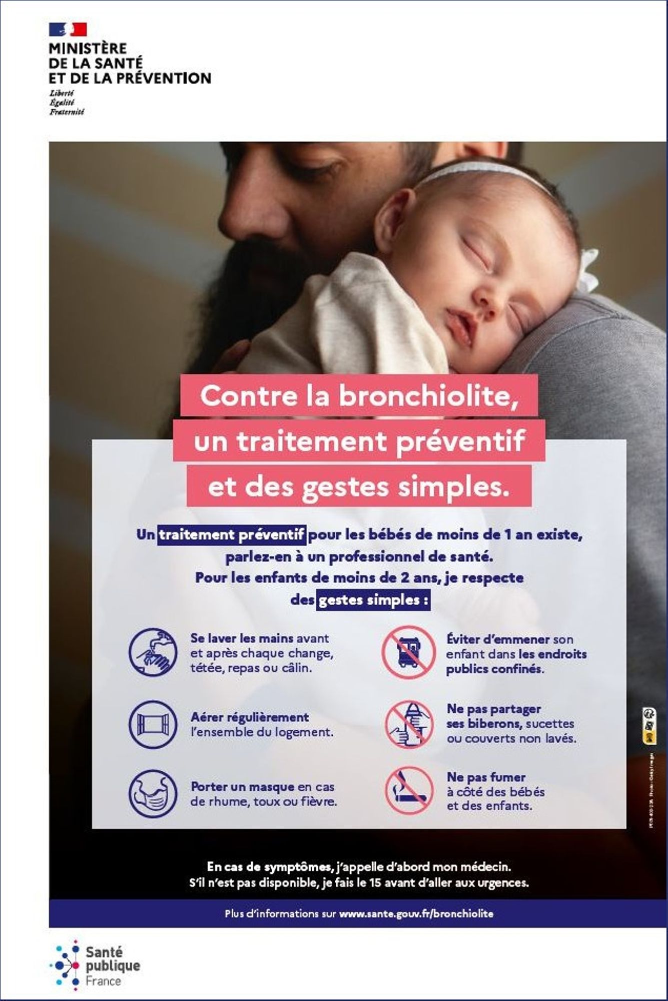 Cette affiche d'information rappelle les gestes barrières à adopter pour protéger les enfants du virus à l'origine de la bronchiolite. Elle met aussi en avant l'existence de traitements préventifs et le renvoi vers le médecin ou le centre 15 en cas de symptômes.