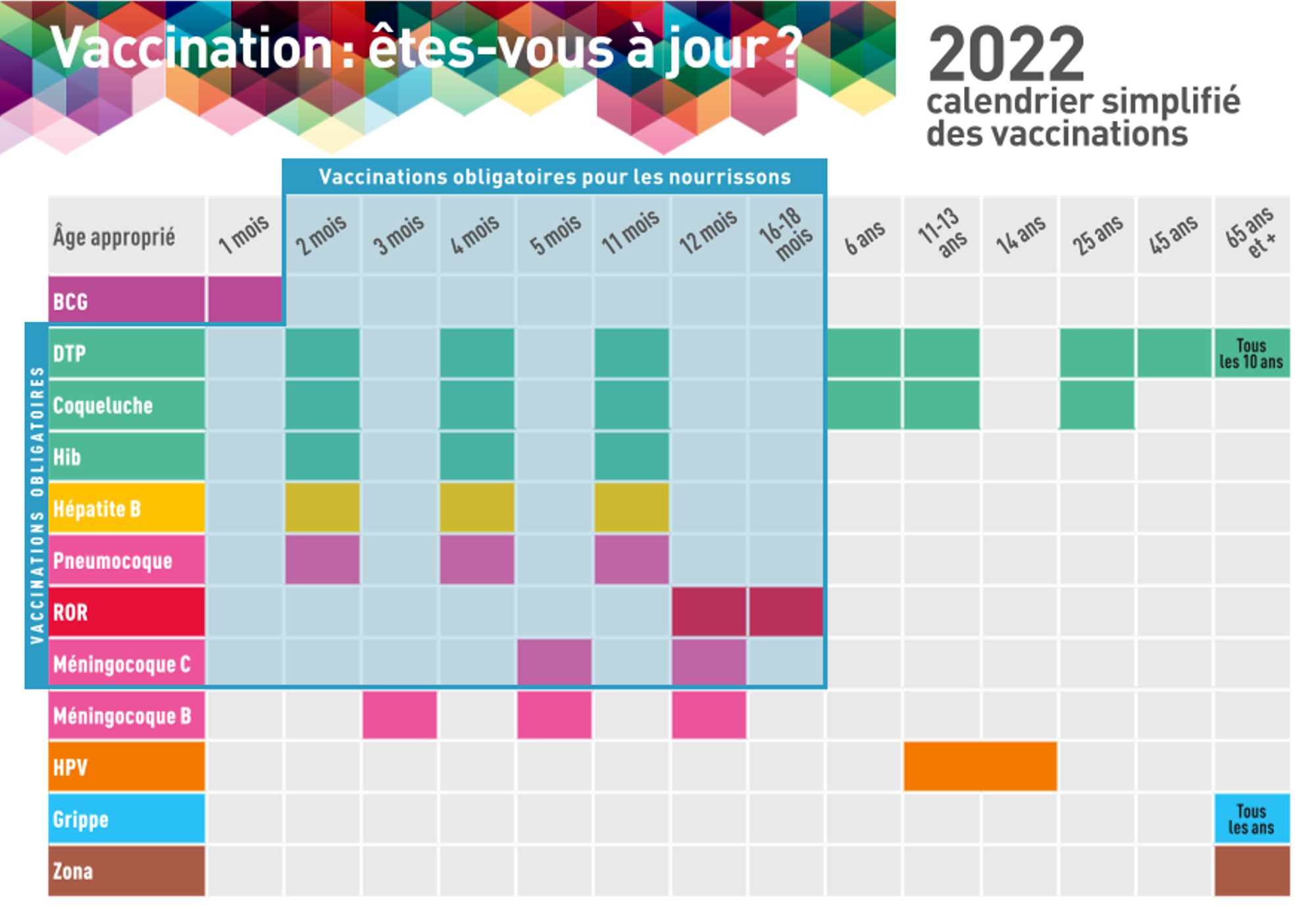 Carte postale du calendrier simplifié des vaccinations 2022. Elle présente les vaccins recommandés à chaque personne tout au long de sa vie et selon sa situation. Elle récapitule, en fonction de l'âge, les vaccins nécessaires pour acquérir une immunité de base et donne des conseils sur les rappels et les retards éventuels dans le programme de vaccination.
