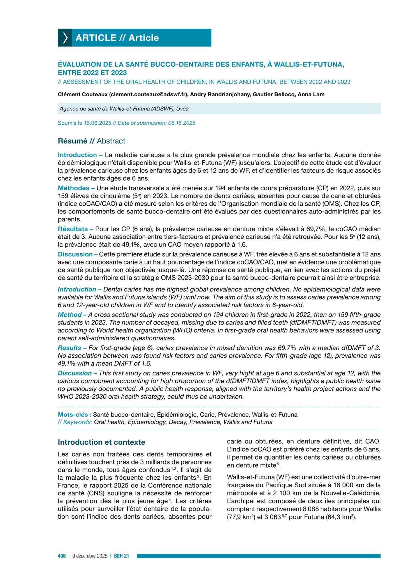 La maladie carieuse a la plus grande prévalence mondiale chez les enfants. Aucune donnée épidémiologique n’était disponible pour Wallis-et-Futuna (WF) jusqu’alors. L’objectif de cette étude est d’évaluer la prévalence carieuse chez les enfants âgés de 6 et 12 ans de WF, et d’identifier les facteurs de risque associés chez les enfants âgés de 6 ans. [Résumé éditeur]