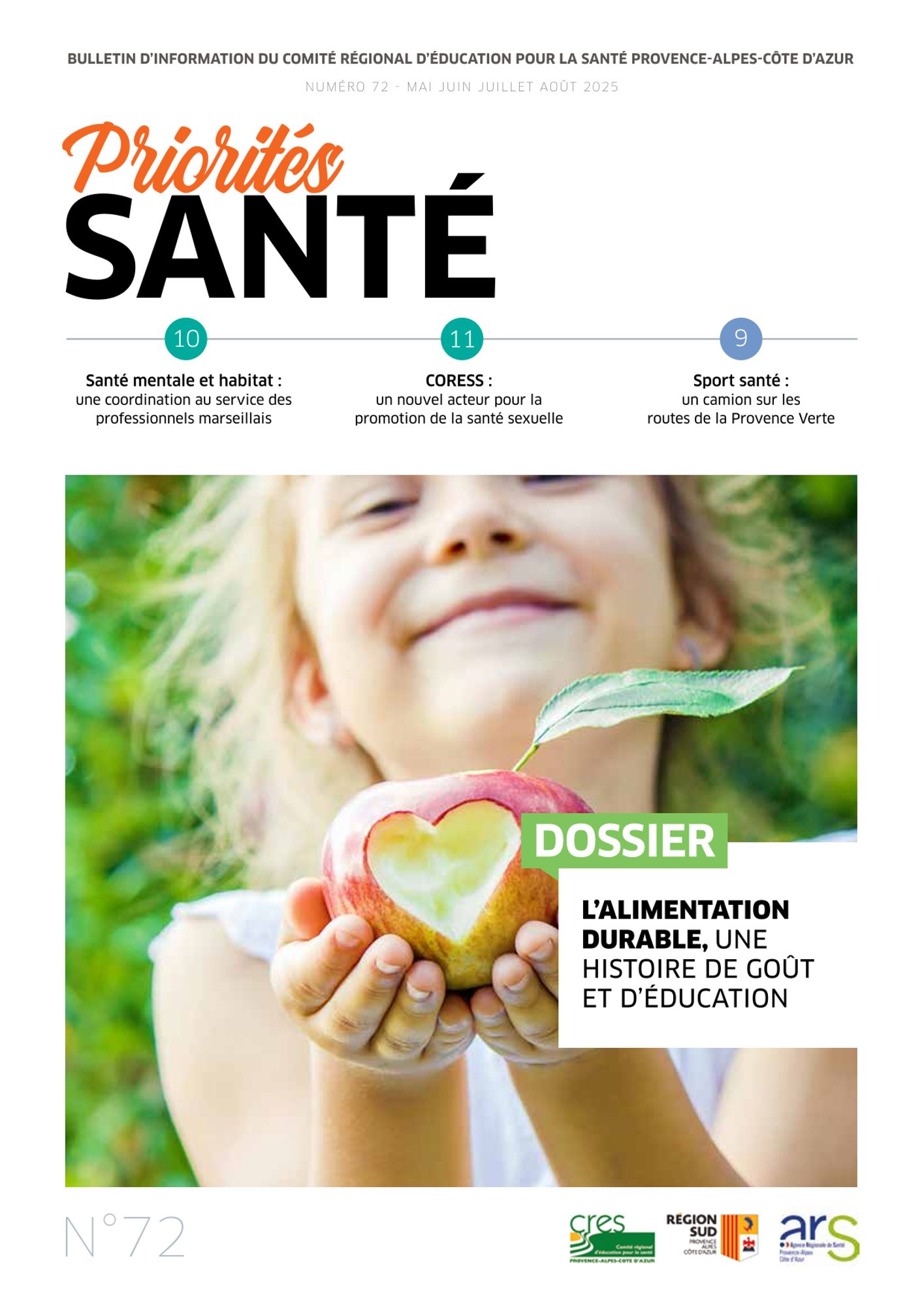 Au sommaire du bulletin du CRES : un dossier sur l'alimentation durable, une histoire de goût et d'éducation, un article sur la santé mentale et habitat, le CORESS, le sport santé etc.