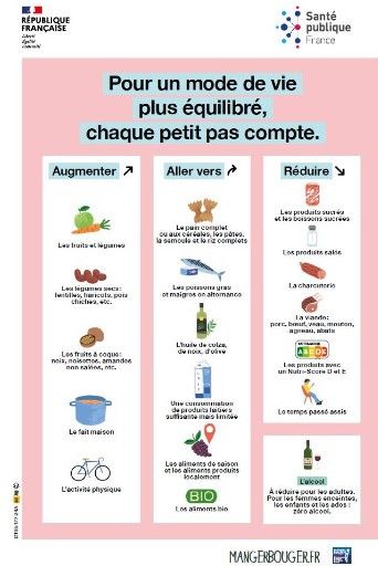 Cette affiche présente les nouvelles recommandations pour la population concernant l'alimentation, l'activité physique et la sédentarité. Elle invite le consommateur à modifier ses habitudes et ses choix, progressivement et à son rythme, autour de trois notions : Augmenter / Aller vers / Réduire.