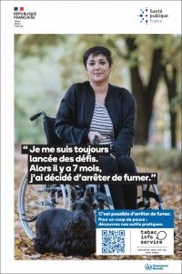 - Affiche incitant à arrêter de fumer et faisant la promotion des aides à l'arrêt de Tabac info service dans le milieu du handicap