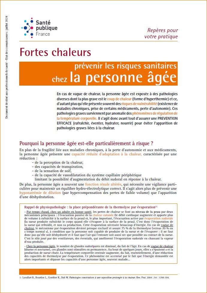 Ce document répond aux principales questions que peut se poser le professionnel de santé (médecin généraliste, etc.) pour prévenir les risques sanitaires liés aux fortes chaleurs chez les personnes âgées.