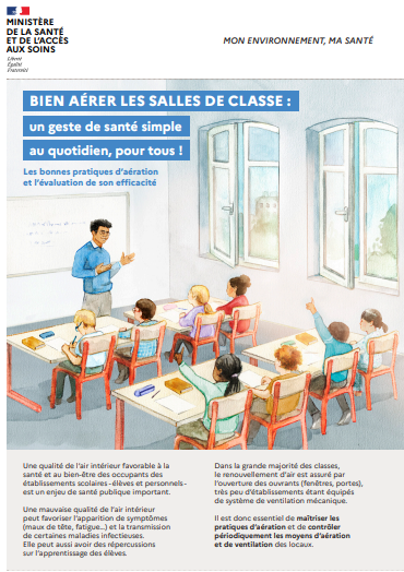Une plaquette d’information intitulée « Bien aérer les salles de classe : un geste de santé simple au quotidien, pour tous » à destination des propriétaires/exploitants des établissements scolaires et de la communauté éducative. Ce document explicite « l’évaluation annuelle des moyens d’aération », qui s’applique obligatoirement à tous les établissements scolaires (publics et privés) dans le cadre de la surveillance réglementaire de la qualité de l’air intérieur.