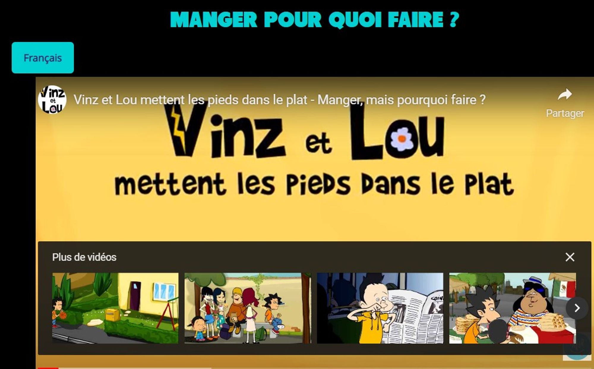 Ce dessin animé entend développer de bonnes habitudes alimentaires chez les enfants : éveiller les papilles au plaisir de la diversité des goûts, éduquer les jeunes à l'esprit critique face à la publicité sur la nourriture, faire prendre conscience que la façon de se nourrir n'est pas anodine, de l'intérêt des repas à heures fixes. 14 épisodes de 2 mn chacun, sur inscription gratuite.