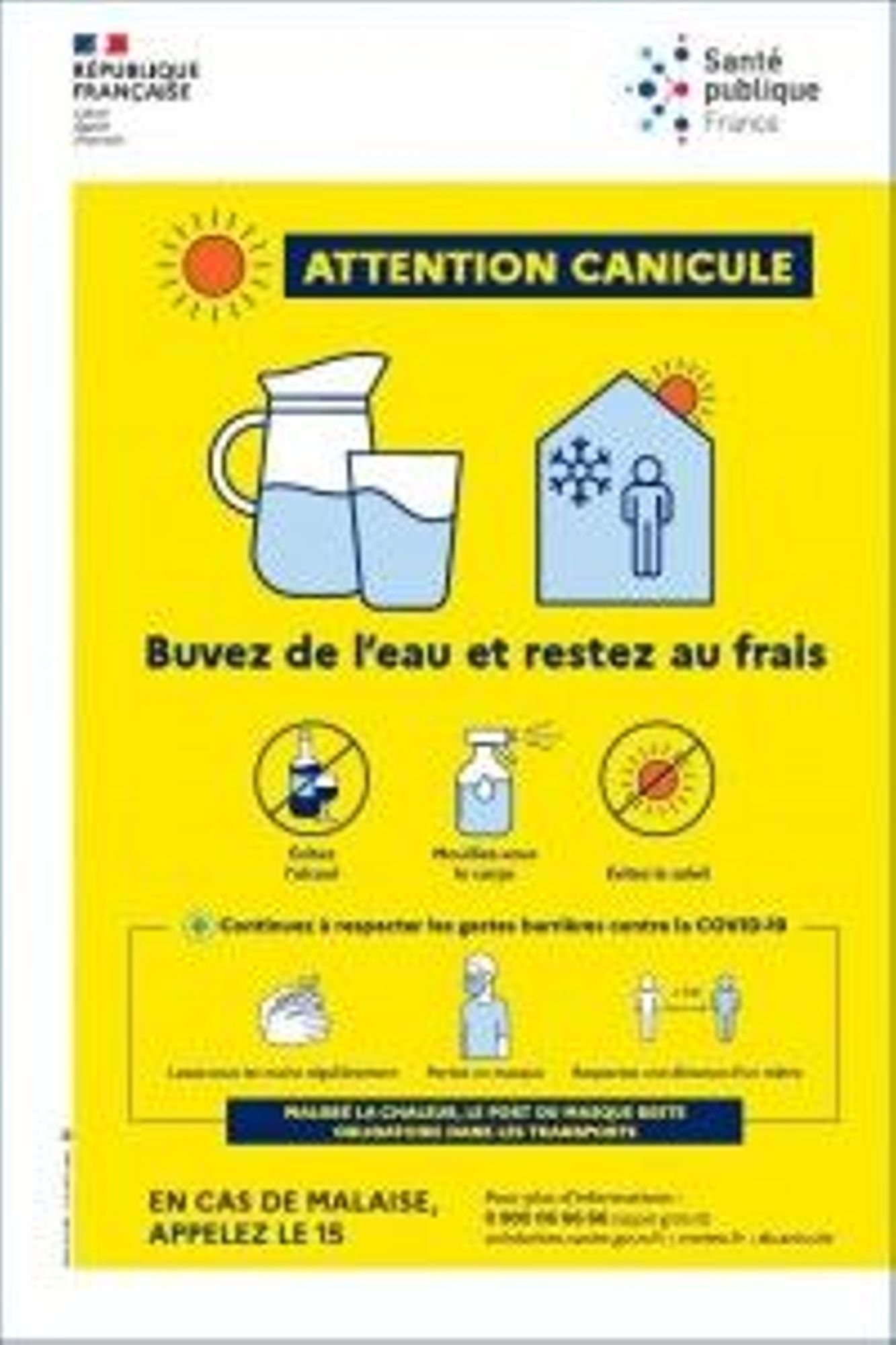 Attention canicule Affiche - Santé Publique France - juin 2020 Thème(s) : Environnement Public(s) : Tout public Cette affiche indique les gestes à adopter dans les transports en cas de canicule. Existe en A4 et 40x60 cm