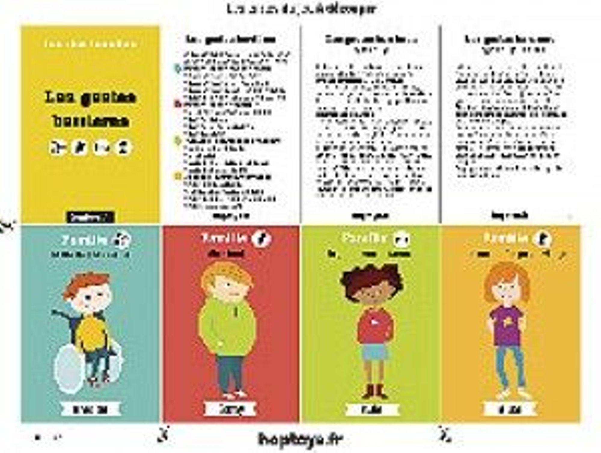 Ce jeu des 7 familles revisité est à destination des enfants pour faciliter l'apprentissage des gestes barrières limitant la transmission des virus. Il se joue de 2 à 3 joueurs. Les cartes comprennent 4 familles de gestes: "je me lave les mains", "je dis bonjour", "je garde mes distances", "je ne me touche pas le visage".