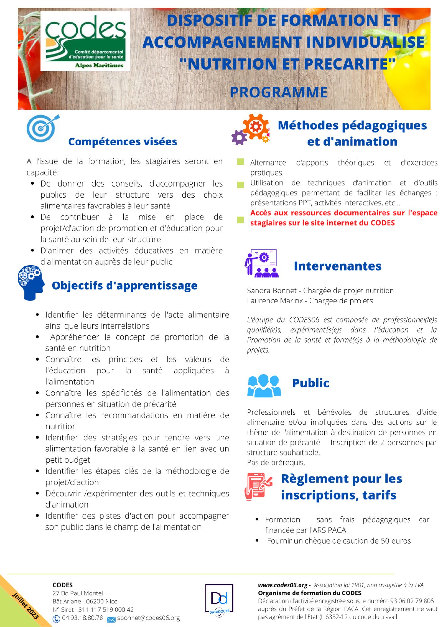 - Je me préinscris à une formation, je remplis le questionnaire des attentes - Inscription en ligne sur Survey Monkey : Dispositif de formation et accompagnement individualisé "Nutrition et Précarité" ou je contacte le CODES06. Afin de faciliter le réinvestissement de la formatio n, il est souhaitable que 2 personnes de la structure participent à la formation.