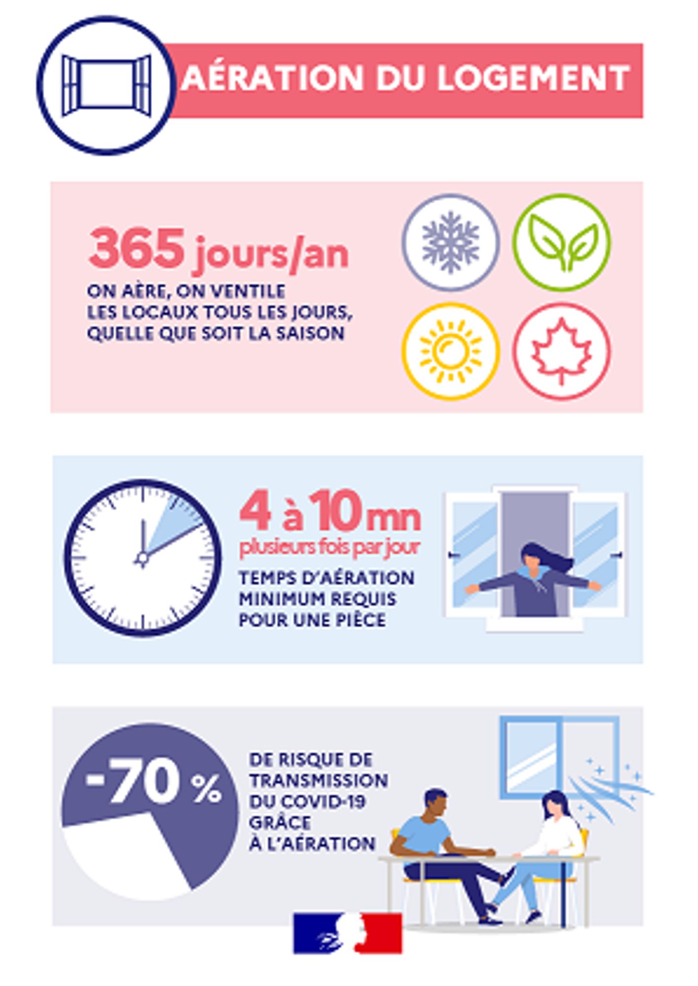 - Aérer régulièrement les espaces clos en ouvrant les fenêtres au moins 10 minutes plusieurs fois par jour, afin de renouveler l’air et réduire la concentration des virus en suspension.