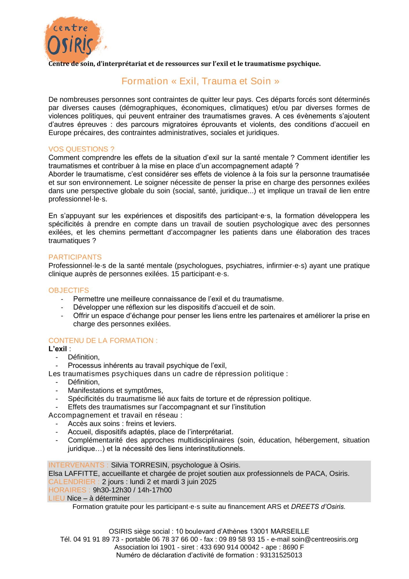 Osiris organise une session de formation sur les thématiques « Exil, trauma et soin » les lundi 3 et mardi 4 juin 2025 à Nice.