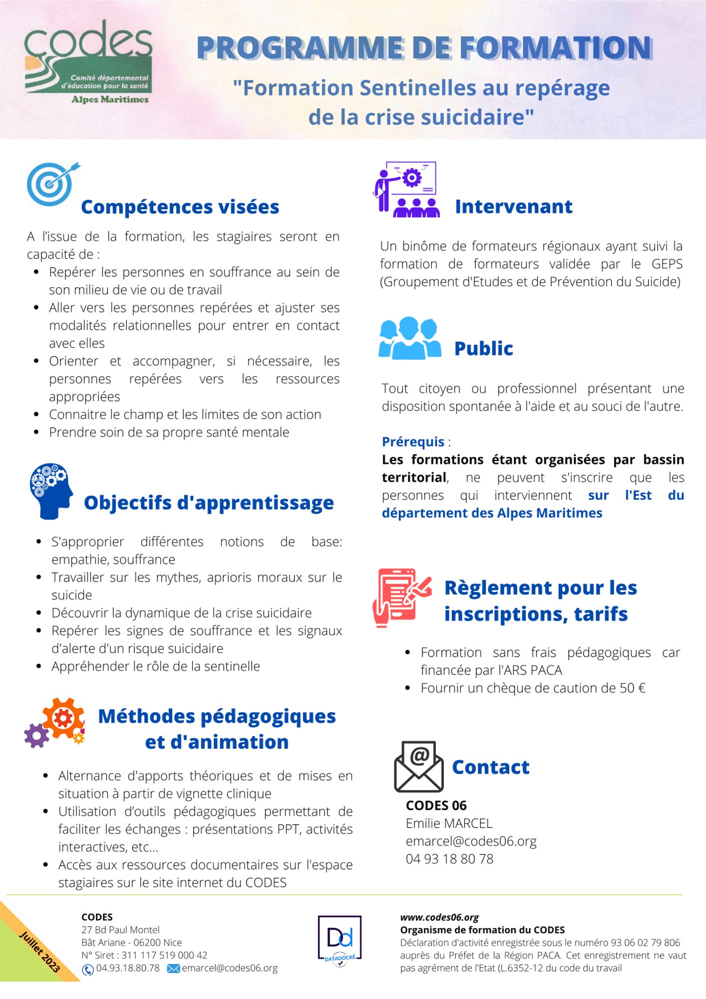 - Au plus tard 7 jours avant le début de la formation je signale au CODES06 les imprévus - annulation, absence, changement de stagiaire.