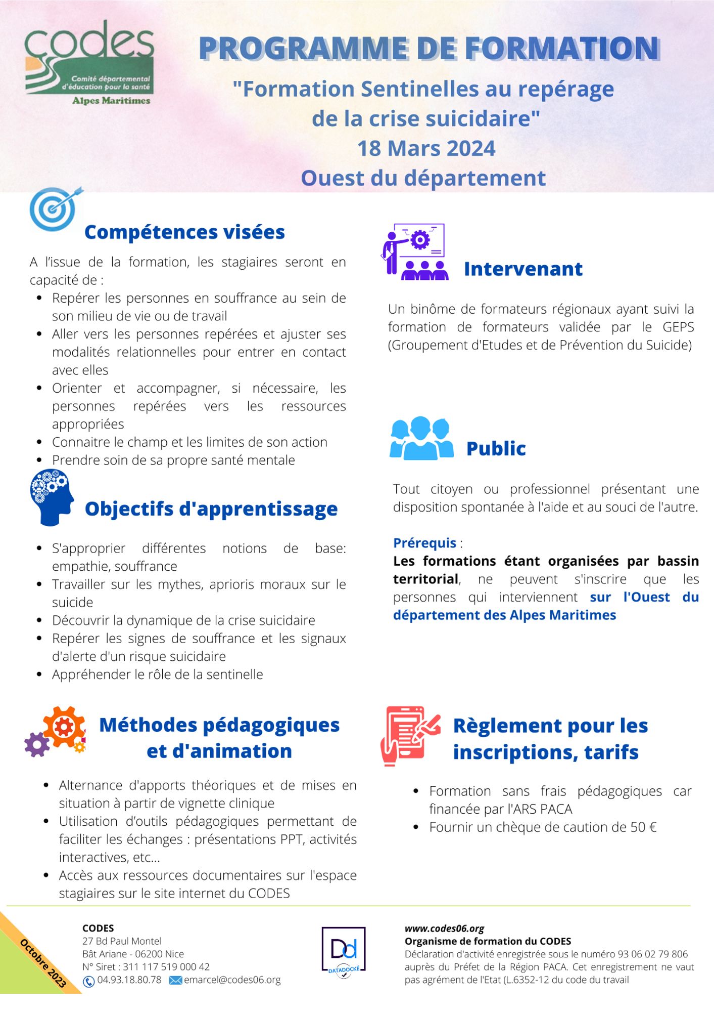 Les formations étant organisées par bassin territorial, ne peuvent s'inscrire que les personnes qui interviennent sur l'Ouest du département des Alpes Maritimes.