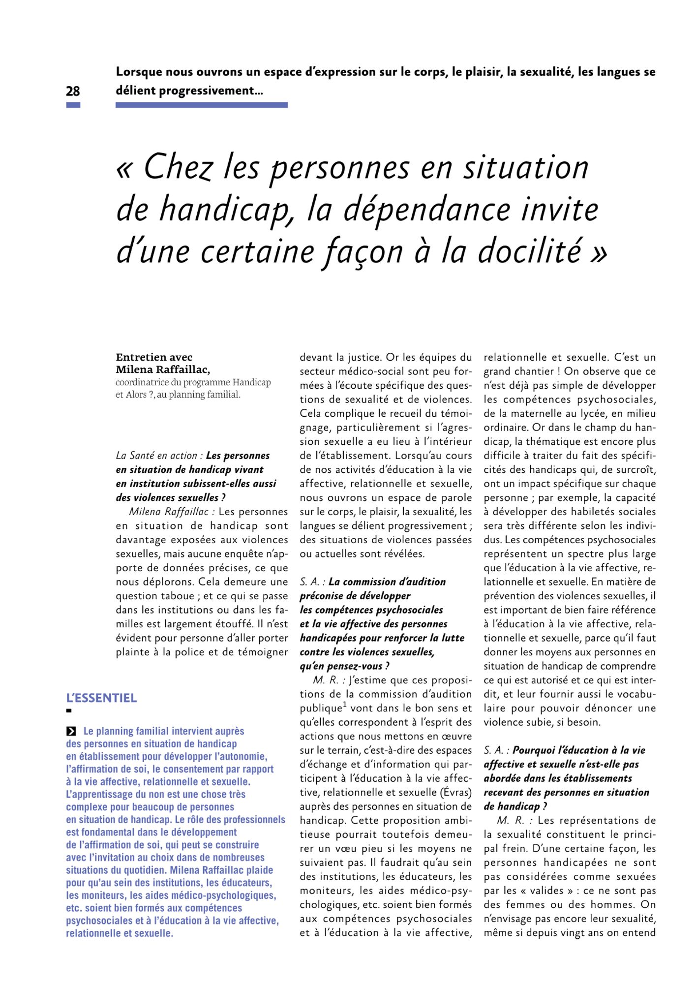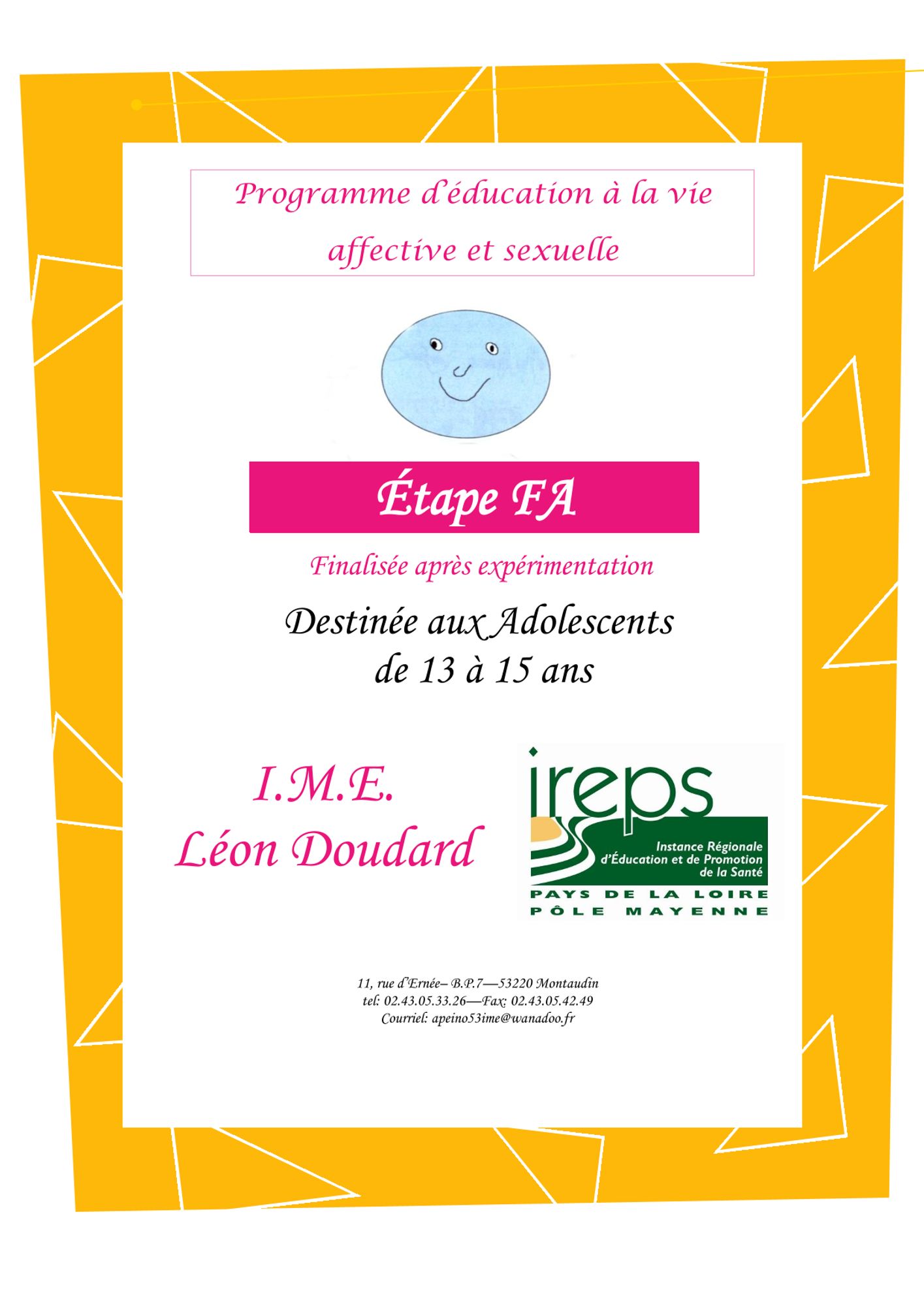 Support de formation : Entendre et parler des sexualités IME Pierre Merli Retrouver dans votre espace stagiaire, les supports de la formation Entendre et parler des sexualités IME Pierre Merli. Documents Travaux IME Pierre Merli Consentement (2.6 Mo) Expression des émotions et leur rôle (2.7 Mo) Photoexpression (3.0 Mo) Secret partagés (2.2 Mo) Secrets partagés - situations choisies (2.2 Mo) Thèmes action d'éducation à la vie sexuelle et affective (2.5 Mo) Outils Programmes IME Handesir PEVAS 8-10ans (2.0 Mo) PEVAS 11-13ans (1.6 Mo) PEVAS 13-15ans (1.4 Mo) PEVAS 16-18ans (1.6 Mo) Outils brochure_moi_mon_corps_et_les_autres_planning_familial (857.0 Ko) brochure_programme_handicap_et_alors_planning_familial (243.9 Ko) Guide des structures ressources 06 (2.6 Mo) Article SPF Violences sexuelles PSH (597.1 Ko) Boite à outils méthodo IREPS Bretagne (2.1 Mo) La prévention du SIDA et des autres MTS dans une perspective d'éducation à la sexualité chez les élèves présentant une déficience intellectuelle (1.1 Mo) Liste DVD Handicap&Sexualité (495.0 Ko) Liste Vidéos Et tt le monde s'en fout (40.9 Ko) Affectivité, Sexualité et Handicap Powerpoints 2. Droits sexuels des personnes en situation de handicap (470.8 Ko) 3. Concepts et Principes Educ Sex (305.1 Ko) 4. Accompagner la découverte des émotions (940.2 Ko) 5. Anatomie organes sexuels (1.0 Mo) 6.1. Données de contexte santé sexuelle des jeunes - handicap (1.2 Mo) 6.2. Dispositifs et structures ressources du territoire (2.4 Mo) 7.1. Loi et consentement (418.6 Ko) 7.2. Le consentement enjeux individuels et collectifs (753.6 Ko) 10. Fiche action éducation VAS (132.2 Ko) Fiche mémo relation d'aide (189.7 Ko) travailleurs_sociaux_modele_d_attestation (493.4 Ko) Pour tout renseignement, veuillez contacter Laurence Marinx - Chargée de projets en Promotion de la Santé Evaluation 19 et 26 Novembre 2021 (272.2 Ko)