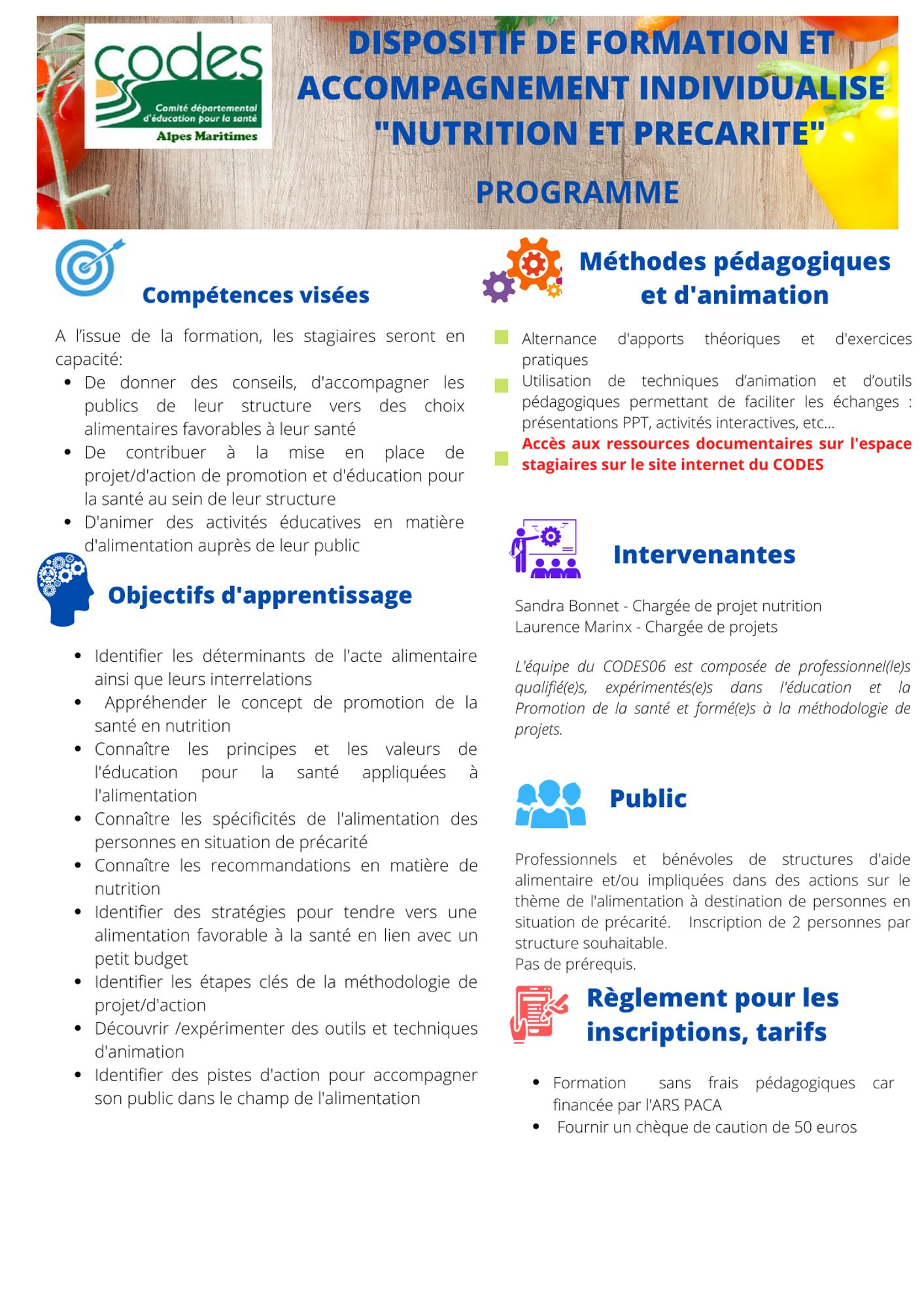 - Je me préinscris à une formation, je remplis le questionnaire des attentes - Inscription en ligne sur Survey Monkey : Dispositif de formation et accompagnement individualisé "Nutrition et Précarité" ou je contacte le CODES06. Afin de faciliter le réinvestissement de la formation, il est souhaitable que 2 personnes de la structure participent à la formation.
