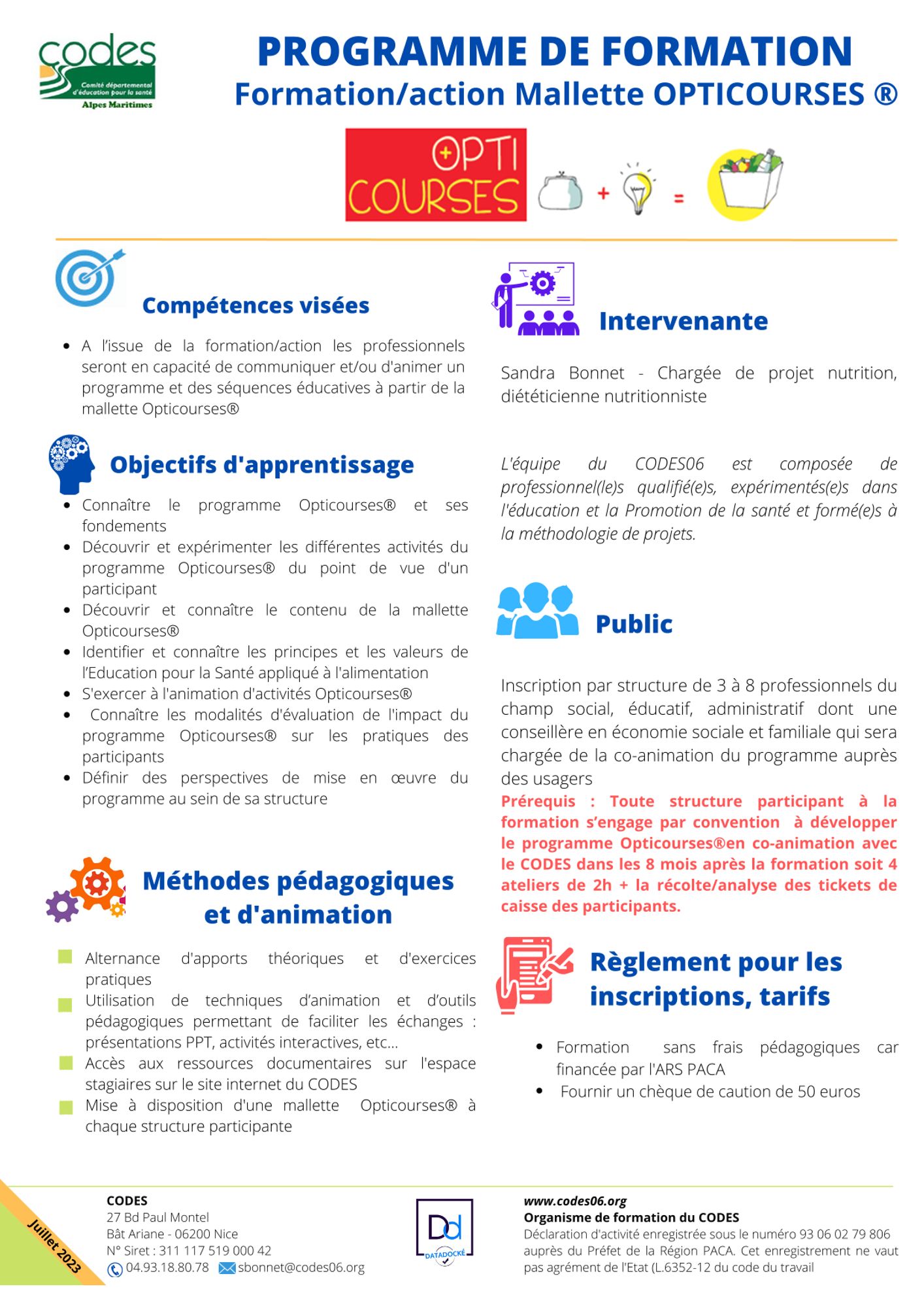 Toute structure participant à la formation s’engage par convention à développer le programme Opticourses®en co-animation avec le CODES dans les 8 mois après la formation soit 4 ateliers de 2h + la récolte/analyse des tickets de caisse des participants.