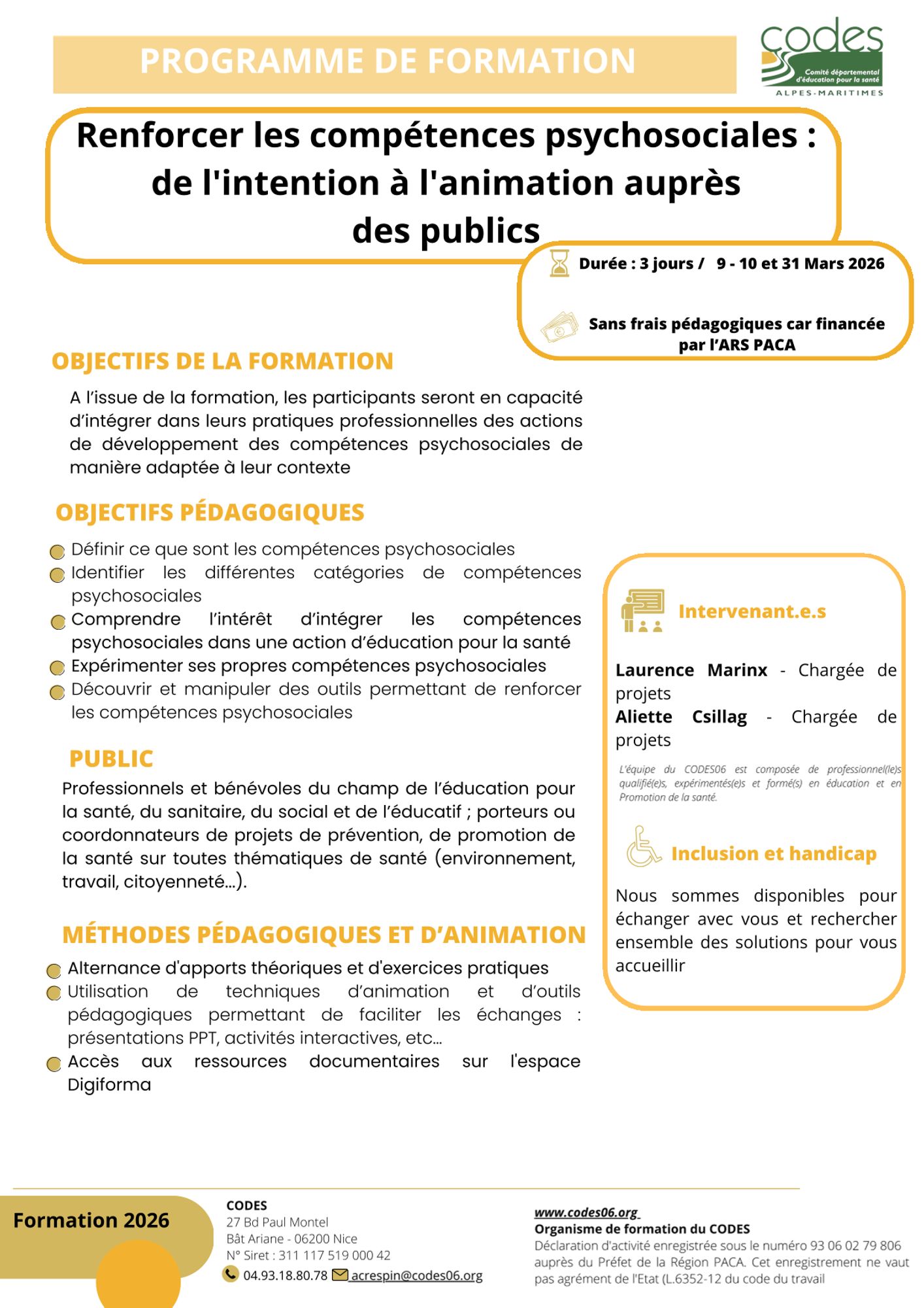 A l’issue de la formation, les participants seront en capacité d’intégrer dans leurs pratiques professionnelles des actions de développement des compétences psychosociales de manière adaptée à leur contexte
