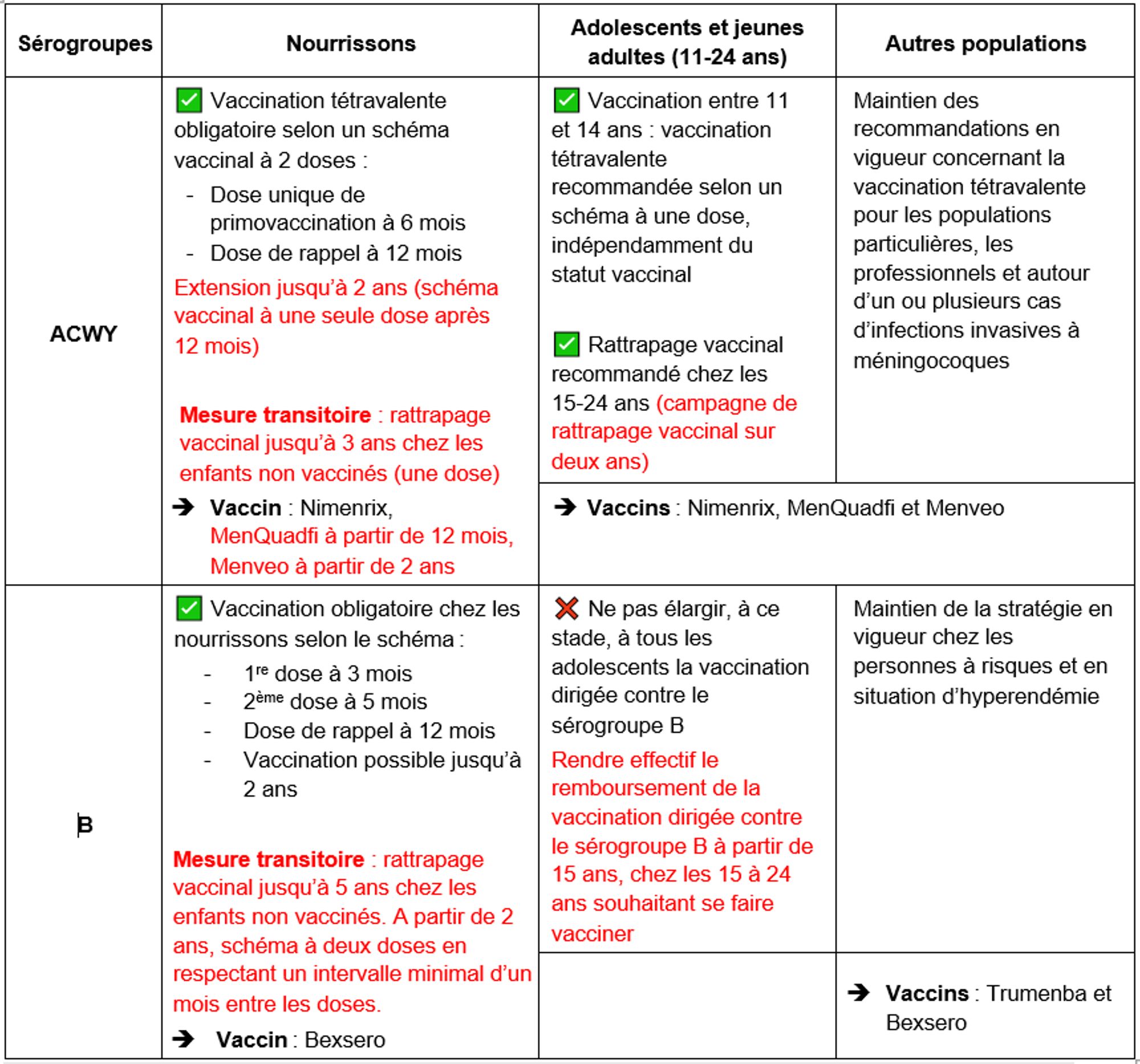 - Elle recommande par ailleurs de façon transitoire la mise en place d’un rattrapage ciblant, d’une part, les enfants jusqu’à 3 ans contre les sérogroupes ACWY et d’autre part, les enfants de 2 à 5 ans contre le sérogroupe B.