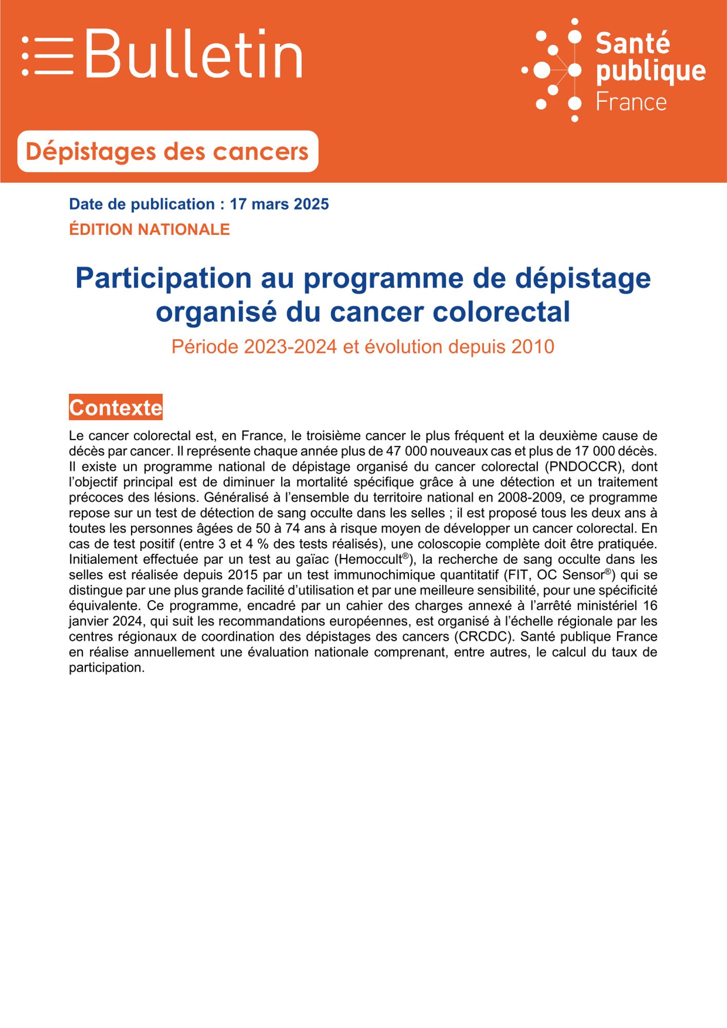 Participation au programme de dépistage organisé du cancer colorectal Période 2023-2024 et évolution depuis 2010.