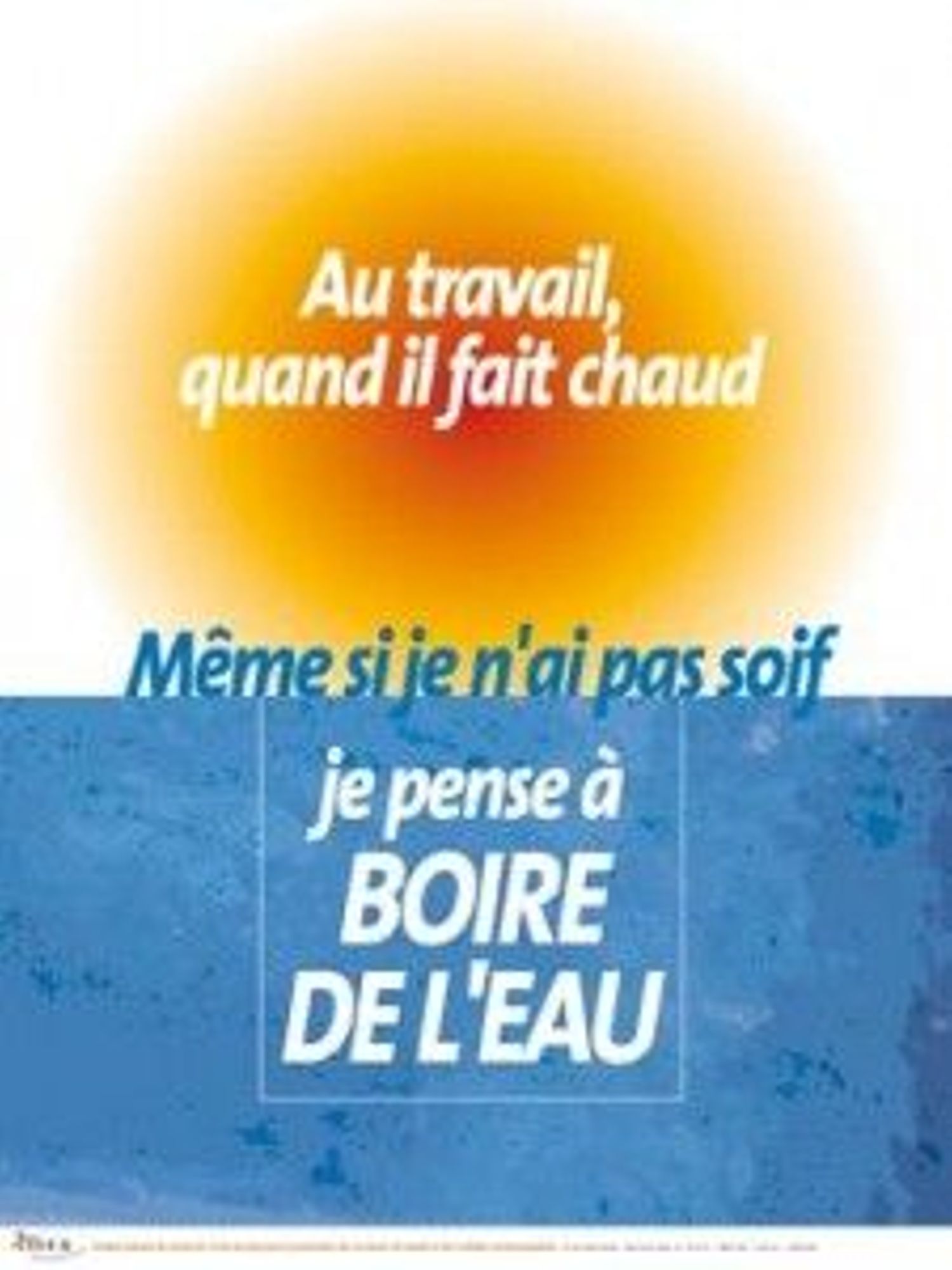 Au travail, quand il fait chaud, même si je n'ai pas soif, je pense à boire de l'eau Affiche - INRS - 2004 Thème(s) : Environnement Public(s) : Adulte Cette affiche sensibilise les travailleurs à l'importance de s'hydrater en période de forte chaleur. 60 x 80 cm