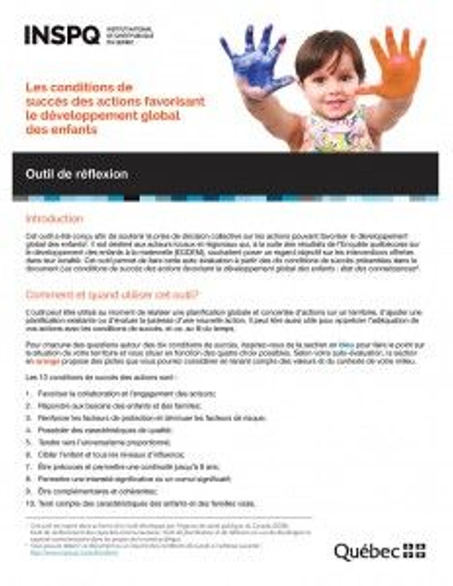 Cet outil a été conçu afin de soutenir la prise de décision collective sur les actions pouvant favoriser le développement global des enfants. Il est destiné aux acteurs qui, à la suite des résultats de l'Enquête québécoise sur le développement des enfants à la maternelle (EQDEM), souhaitent poser un regard objectif sur les interventions en cours dans leur localité. Cet outil permet de faire cette auto-évaluation à partir des dix conditions de succès présentées dans le document Les conditions de succès des actions favorisant le développement global des enfants : état des connaissances. Il peut être utilisé au moment de réaliser une planification globale et concertée d’actions sur un territoire, d’ajuster une planification existante ou d’évaluer la justesse d’une nouvelle action. Il peut être aussi utile pour apprécier l’adéquation des actions avec les conditions de succès.