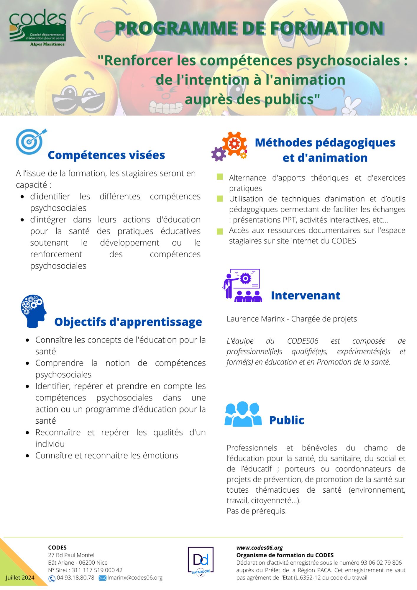 La formation, proposée dans le cadre du DRSPI-PPS (Dispositif régional de soutien aux politiques et aux interventions en prévention et promotion de la santé), est financée par l’Agence Régionale de santé PACA.