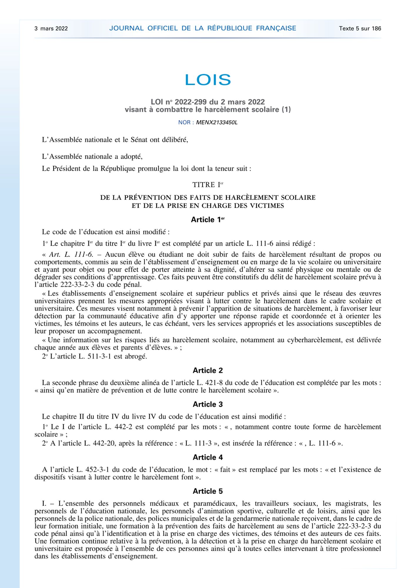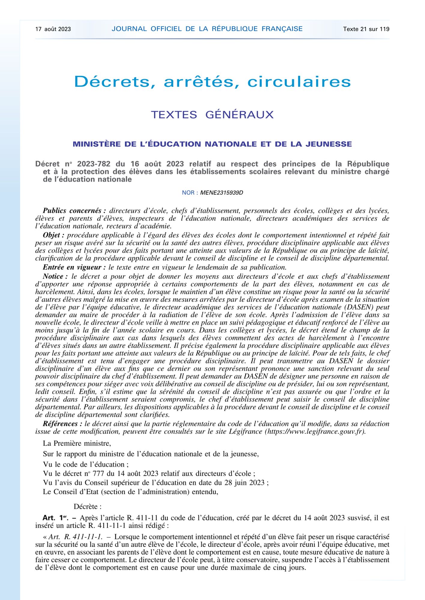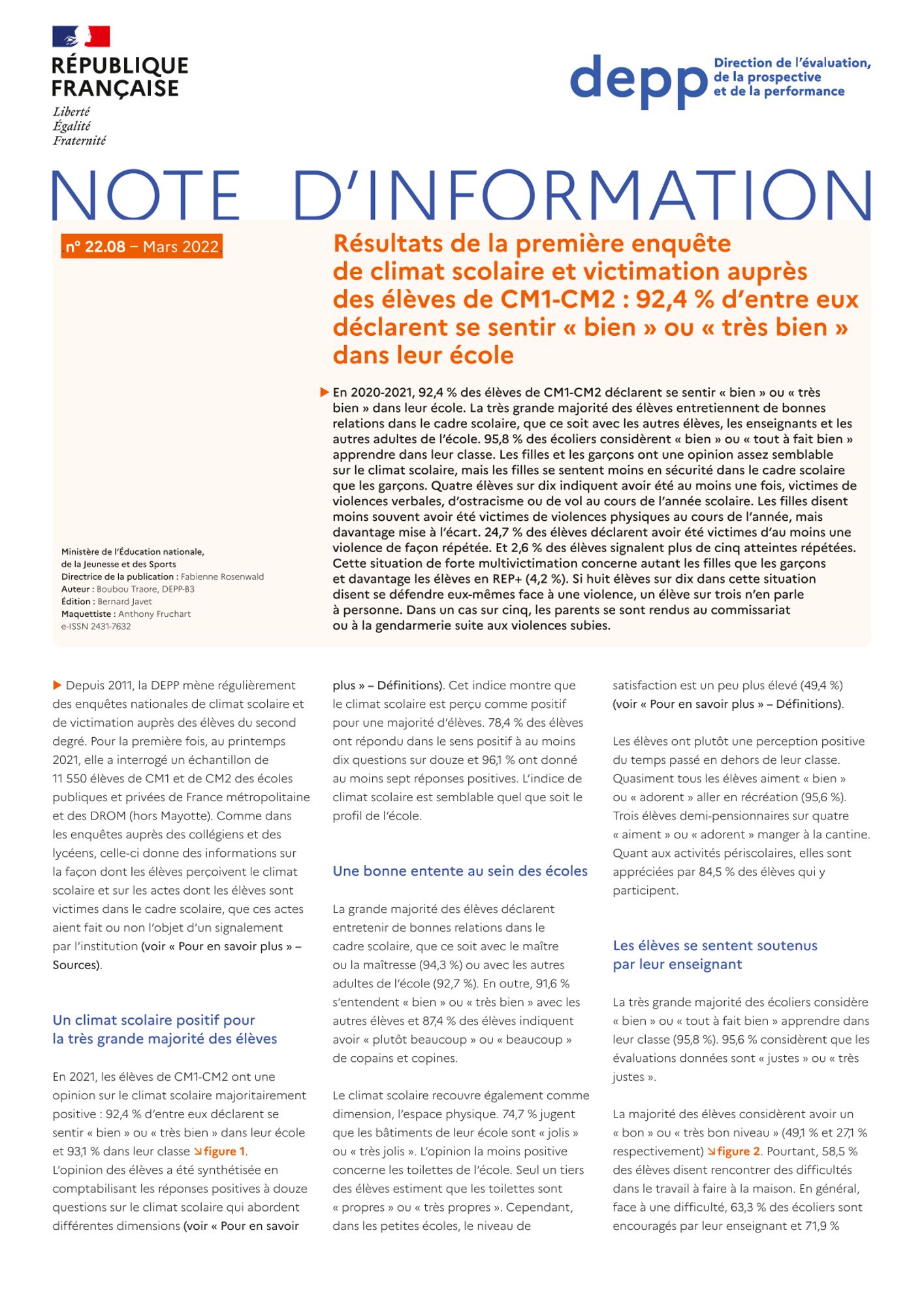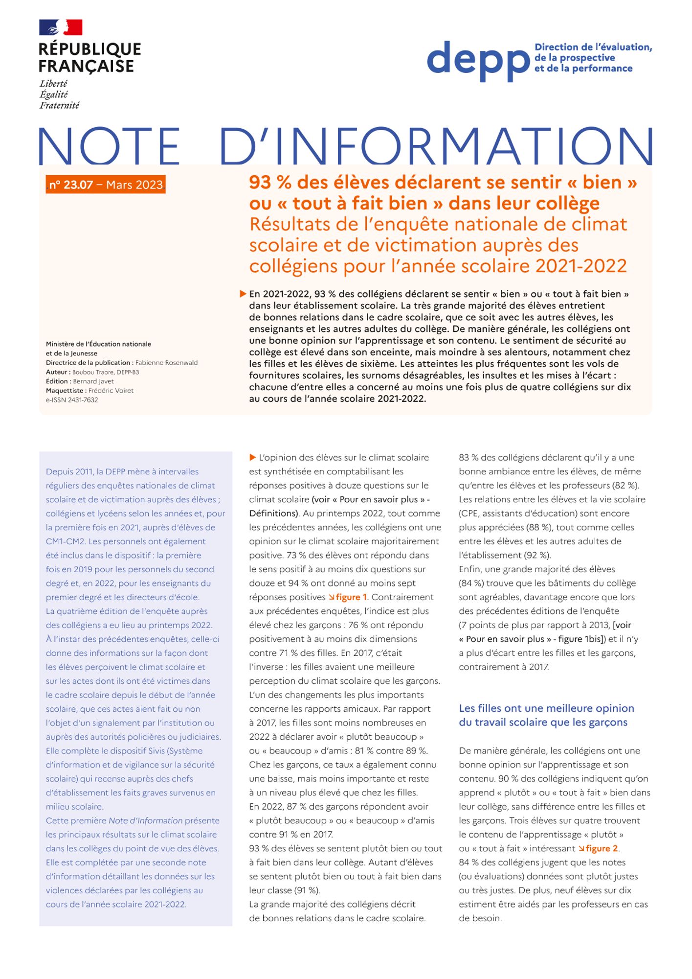Ressources à consulter 2023 La circulaire n°2013-100 du 13 août 2013 sur la prévention et la lutte contre le harcèlement à l'École (204.4 Ko) Résultats de l’enquête de climat scolaire et victimation auprès des lycéens pour l’année scolaire 2017-2018 / Tamara Hubert (109.1 Ko) La note d'information n°23.07 de la Depp (Mars 2023), 93 % des collégiens déclarent se sentir bien dans leur collège. (228.5 Ko) Les résultats de la première enquête de climat scolaire et victimation menée auprès des élèves de CM1 et de CM2 : 92,4 % d’entre eux déclarent se sentir « bien » ou « très bien » dans leur école (312.7 Ko) LOI no 2022-299 du 2 mars 2022 visant à combattre le harcèlement scolaire (182.4 Ko) Décret n° 2023-782 du 16 août 2023 relatif au respect des principes de la République et à la protection des élèves dans les établissements scolaires relevant du ministre chargé de l'éducation nationale (154.2 Ko) Sur education.gouv.fr Journée nationale de lutte contre le harcèlement à l'école Politique de lutte contre le harcèlement à l'École Campagne 2023 - Ne minimisons pas ce que vivent les enfants Plan interministériel de lutte contre le harcèlement à l'École Sur eduscol La lutte contre le harcèlement entre élèves