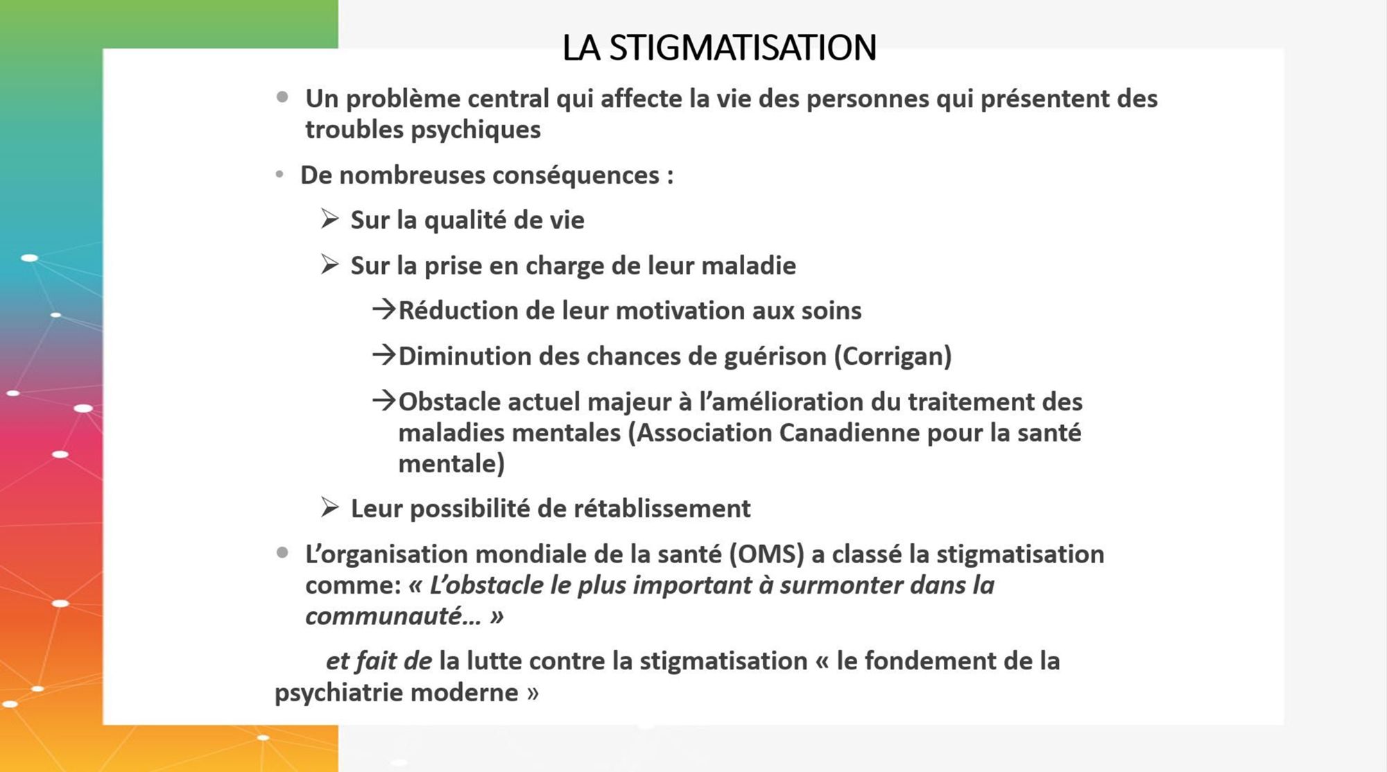 L’organisation mondiale de la santé a classé la stigmatisation comme « l’obstacle le plus important à surmonter dans la communauté » et a fait de la lutte contre la stigmatisation : « Le fondement de la psychiatrie moderne ».