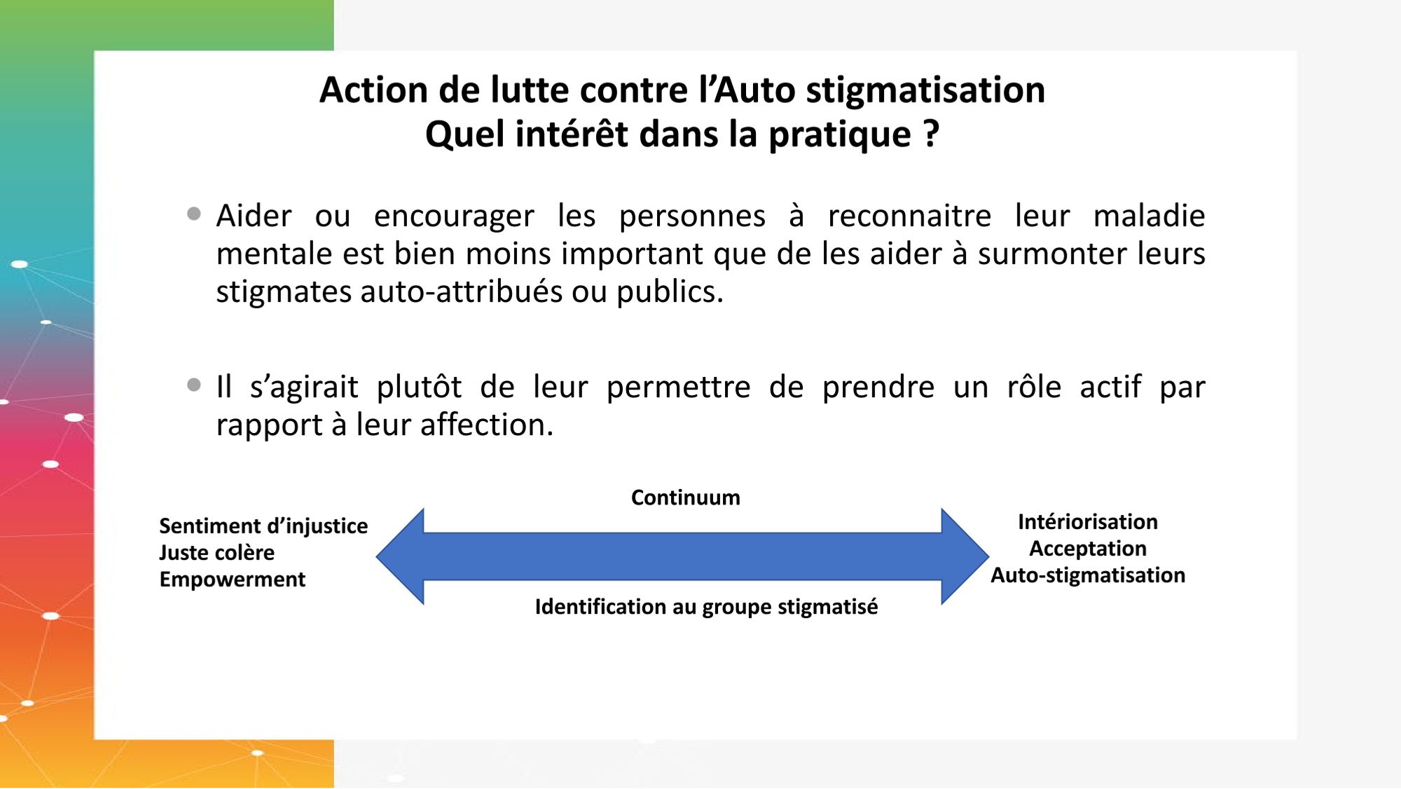 Ainsi il apparaît que l’auto stigmatisation est une barrière majeure au rétablissement notamment en limitant le recours et la participation aux soins. Pour cette raison, la mise en place de modules « simples » ayant pour finalité de réduire l’auto stigmatisation, d’améliorer l’estime de soi ainsi que l’efficience globale de la prise en charge thérapeutique sont de nature à améliorer la qualité de vie de ces personnes.
