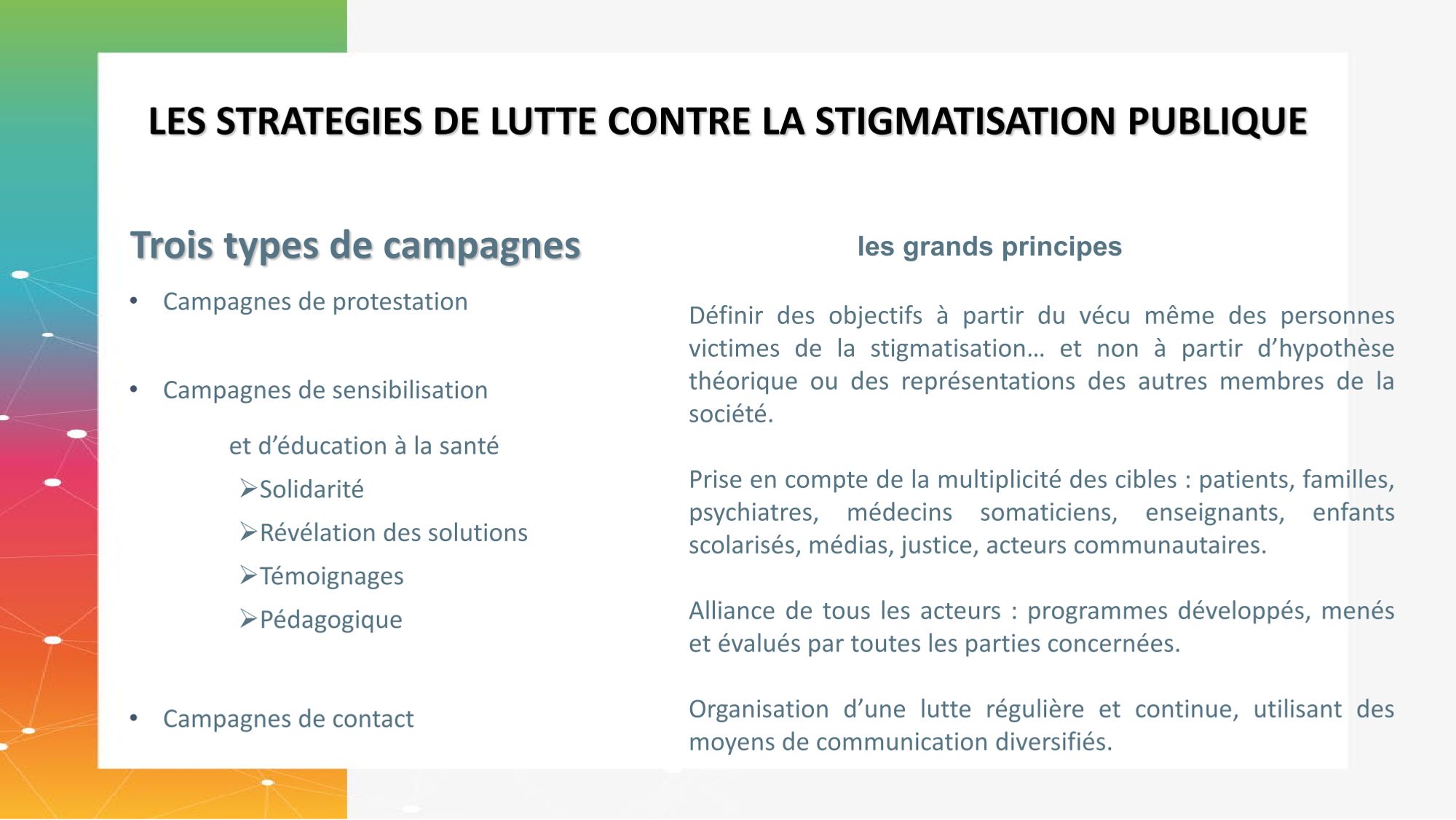 Couplée à la dimension éducationnelle, cette stratégie se révèle le plus efficace moyen de lutte contre la stigmatisation et la discrimination tout en augmentant les attitudes positives envers les personnes malades.