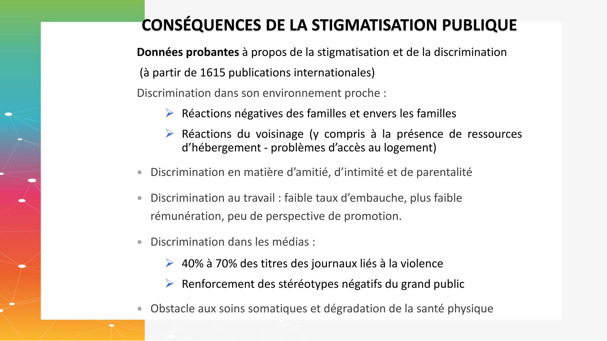 Les données probantes concernant les conséquences de la stigmatisation et de la discrimination (à partir de 1615 publications internationales) mettent en évidence des discriminations dans l’environnement proche (réactions négatives des familles et envers les familles, taux élevé d’itinérance, problèmes de voisinage et d’accès au logement) ; des discriminations en matière d’amitié, d’intimité et de parentalité avec risque d’isolement social ; des discriminations au travail (faible taux d’embauches, plus faible rémunération, peu de perspectives de promotion).