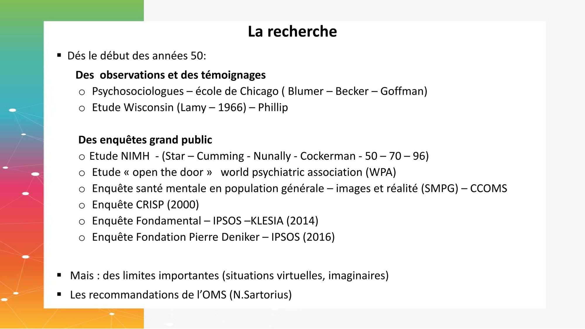 Face à ce constat l’association mondiale de psychiatrie (WPA- N. Sartorius) a préconisé de conduire ces travaux à partir du vécu même des personnes confrontées à la stigmatisation et non pas à partir d’hypothèses théoriques ou à partir des représentations des autres membres de la société.