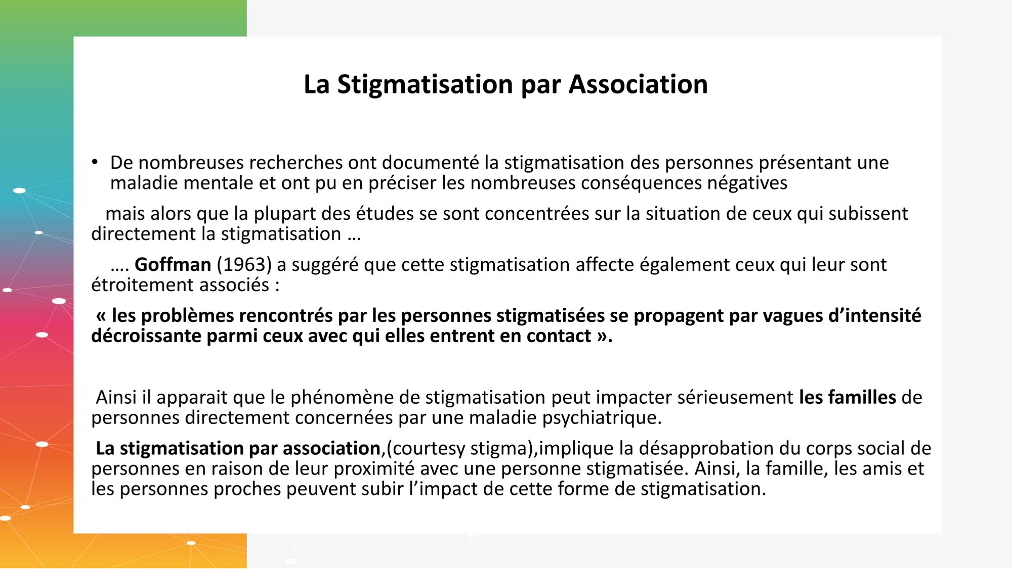 Cependant, on constate qu’au-delà de ces diverses appellations, peu de recherches ont été menées sur cet aspect dans le champ de la santé mentale, sur la façon dont les proches perçoivent et vivent cette stigmatisation et sur la façon dont ils peuvent lutter contre cette stigmatisation.