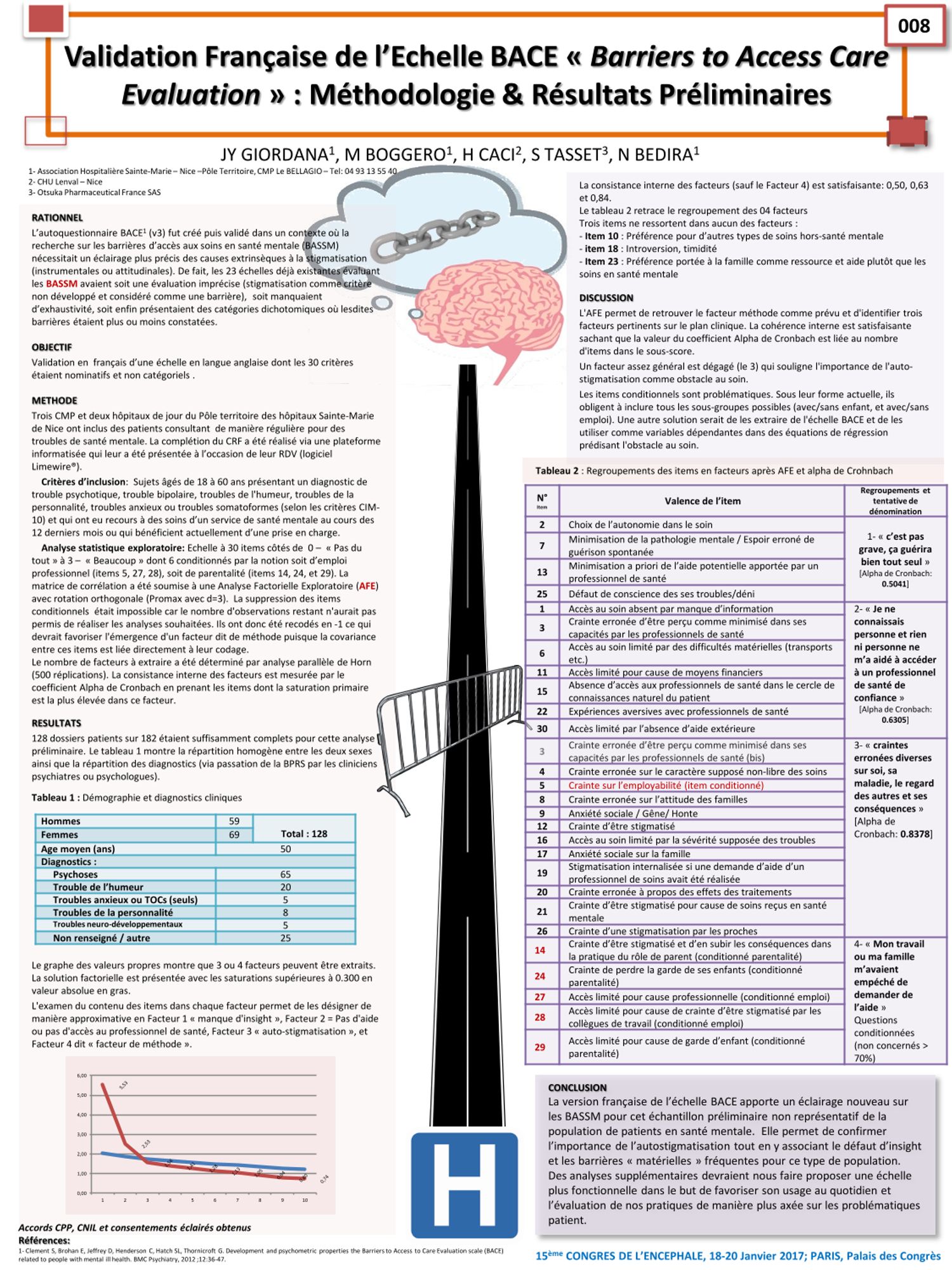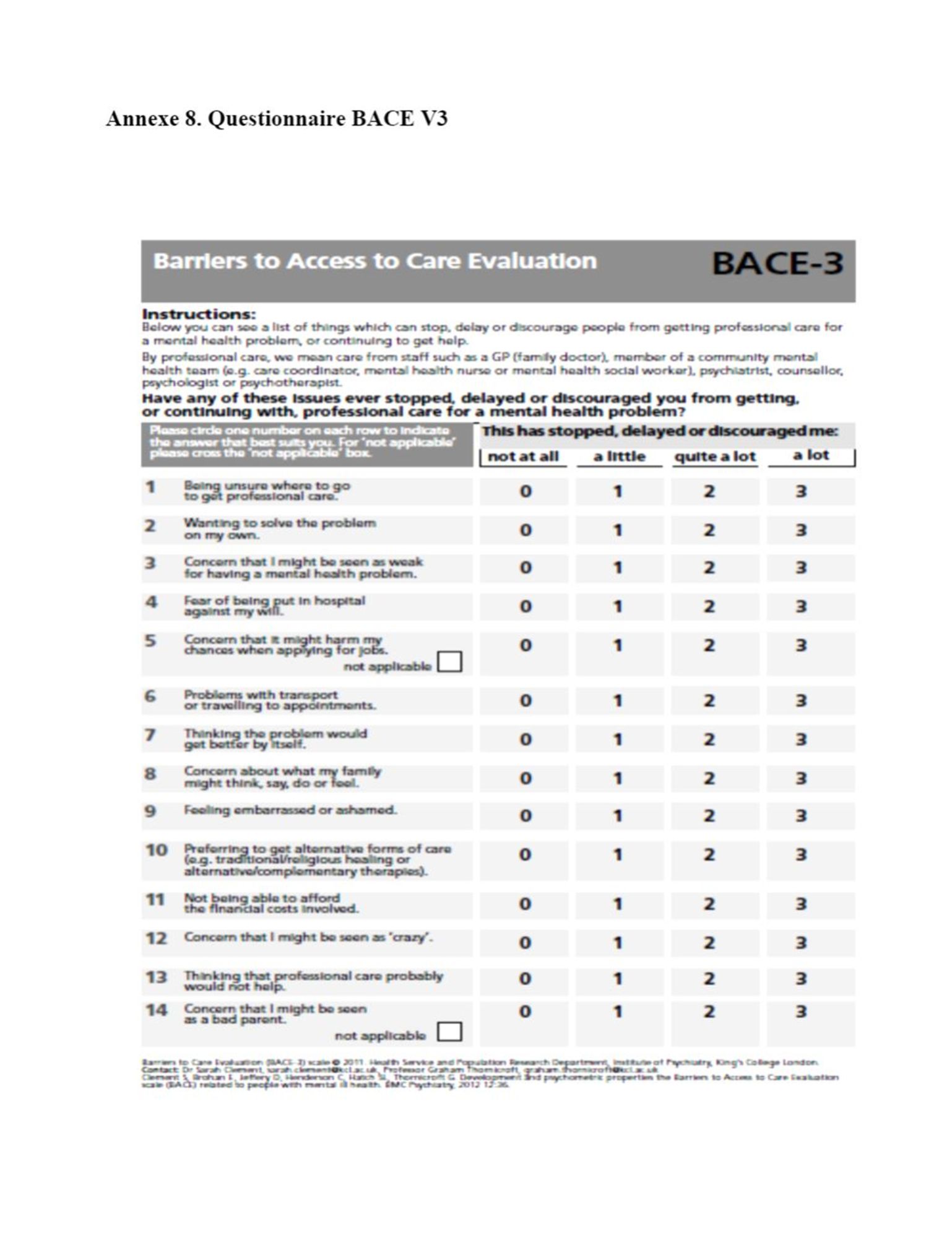L'échelle BACE Consultez l'échelle BACE en Français (164.5 Ko) Validation Française de l’Echelle BACE « Barriers to Access Care Evaluation » : Méthodologie & Résultats Préliminaires (389.1 Ko) Consultez l'échelle BACE en Anglais (236.6 Ko) Articles de références Les barrières à l’accès aux soins : validation de la BACE-3 française - L'Encéphale, Volume 49, Issue 4, August 2023, Pages 393-398
