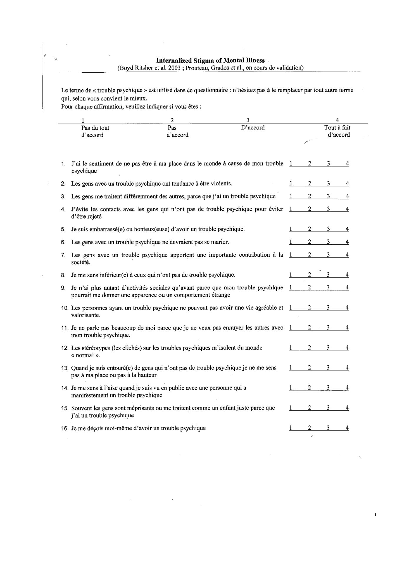 L’échelle ISMI Consultez l'échelle ISMI (128.9 Ko) Articles Internalized stigma of mental illness: Psychometric properties of a new measure, 2003? Psychiatry Research 121, PP. 31-49