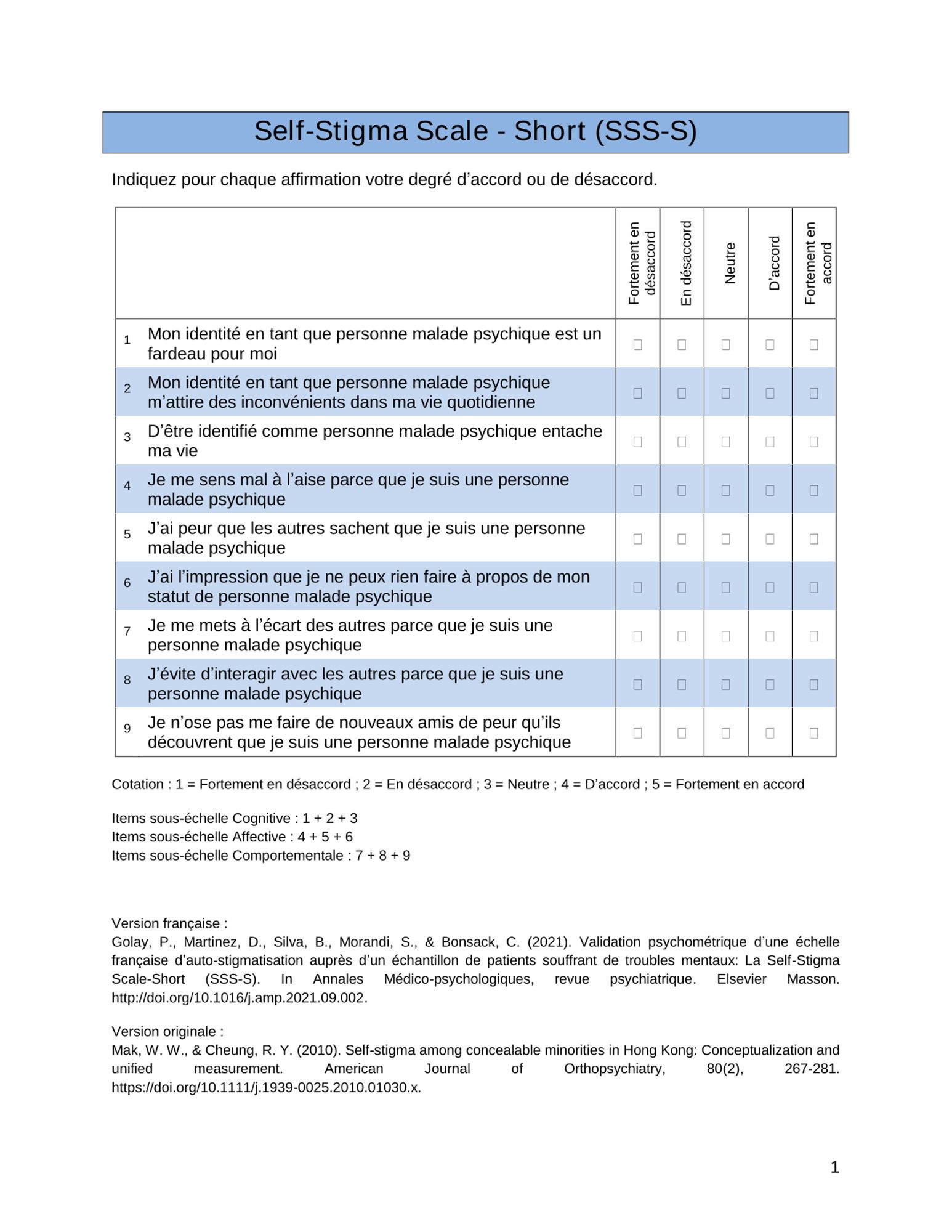 L'échelle la Self Stigma Scale – Short – SSS-S Consultez L'échelle la Self Stigma Scale – Short – SSS-S (315.6 Ko) Articles de références Validation psychométrique d’une échelle française d’auto-stigmatisation auprès d’un échantillon de patients souffrant de troubles mentaux : la Self-Stigma Scale-Short (SSS-S) - Annales Médico-psychologiques, Volume 180, Issue 9, Nov 2022, Pages 899-904