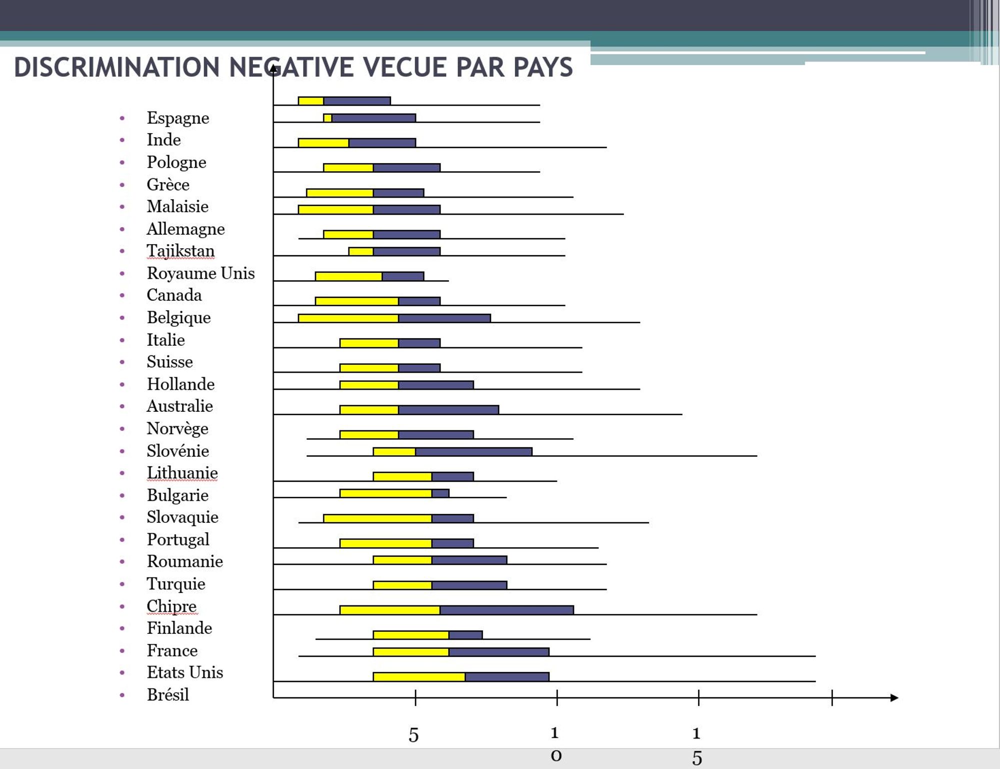 Sur le tableau la barre du milieu représente la moyenne par pays et l’étendue de la case illustre l’étendue des réponses par pays. Les moyennes par pays vont de 3,4 (Espagne) jusqu’à 7,9 (Brésil) avec une moyenne des moyennes à 5,6.