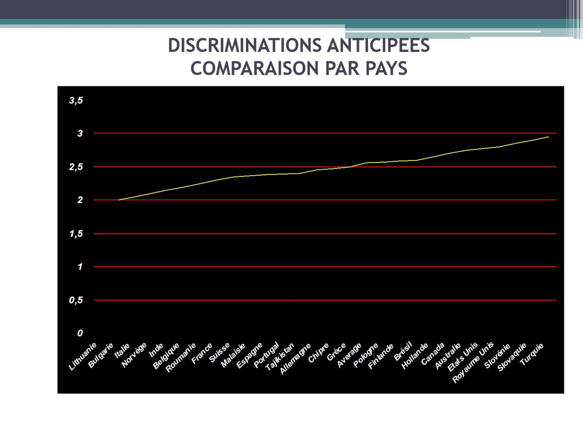 Le score moyen par pays 1,9 (Lituanie) à 2,9 (Turquie) avec une moyenne globale de 2,4.