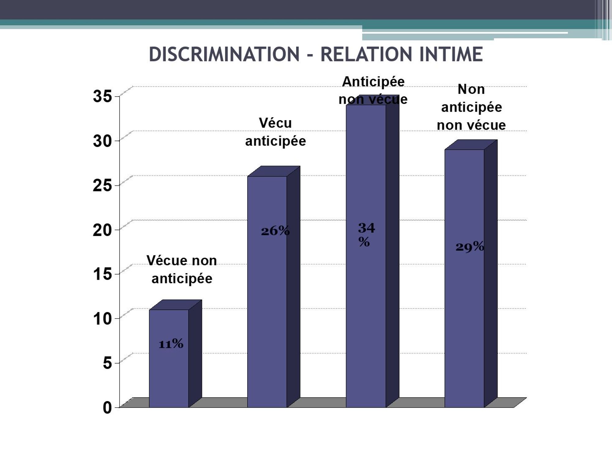 Les taux de discrimination vécue sont élevés et homogènes dans tous les pays et légèrement plus de la moitié des participants ont anticipé une discrimination qu’ils n’avaient pas expérimenté.