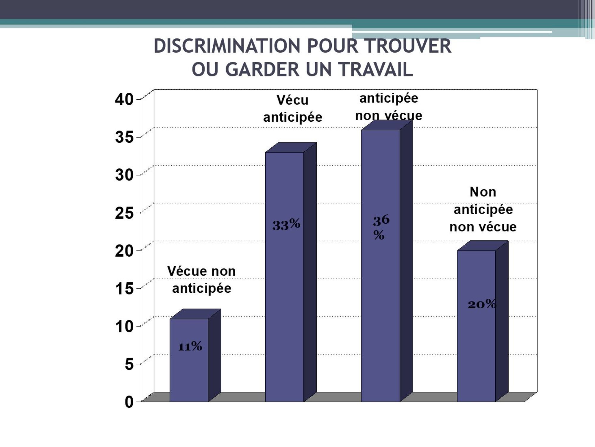 Enfin la discrimination anticipée vis-à-vis de la recherche d’emploi et des relations personnelles proches est plus fréquente que la discrimination réellement expérimentée dans ces domaines.