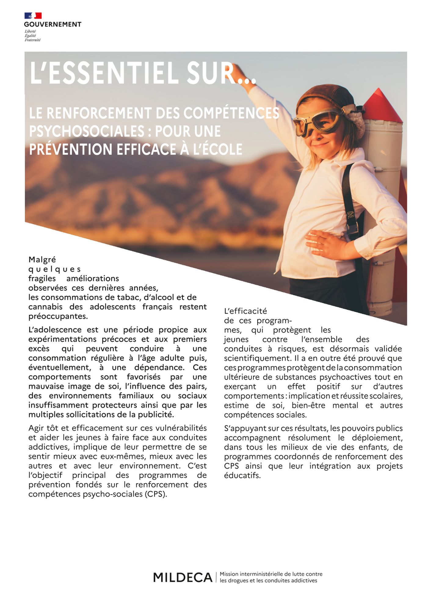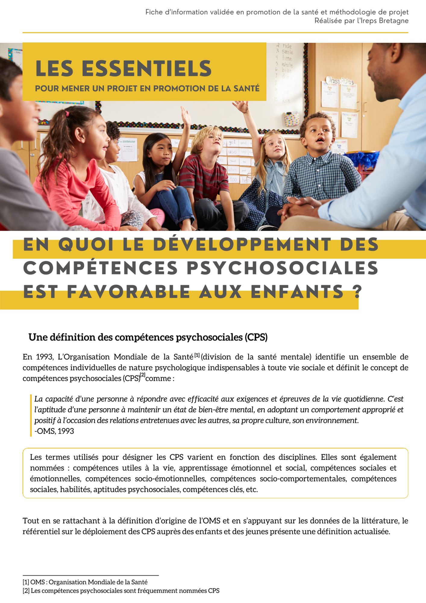 Les essentiels à lire sur les CPS 2023 Les compétences psychosociales : l’essentiel à savoir (345.8 Ko) Infographie Les compétences psychosociales (101.3 Ko) Les CPS : un référentiel pour un déploiement auprès des enfants et des jeunes - Santé Publique France (4.5 Mo) Les CPS : état des connaissances scientifiques et théoriques - Santé Publique France (4.0 Mo) Instruction interministérielle du 19 août 2022 relative à la stratégie nationale de développement des CPS chez les enfants et les jeunes (471.7 Ko) L'essentiel sur le renforcement des CPS : pour une prévention efficace à l'école - MILDECA (1.8 Mo) Bonnes idées & pratiques prometteuses : CPS - IREPS ARA (8.7 Mo) Repères pour la pratiques : développer les CPS des enfants - Promotion Santé Bretagne (4.9 Mo) Les CPS : un levier pour la promotion de la santé - Education & Santé (1.1 Mo) En quoi le développement des CPS est favorable aux enfants ? - IREPS Bretagne (1.2 Mo)