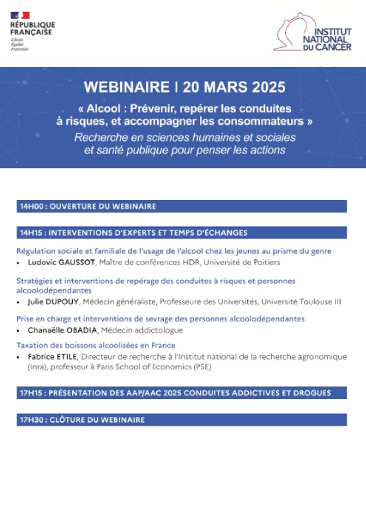 Webinaire | L’Institut national du cancer organise un webinaire « Alcool : Prévenir, repérer les conduites à risques, et accompagner les consommateurs. Recherche en sciences humaines et sociales et santé publique pour penser les actions »